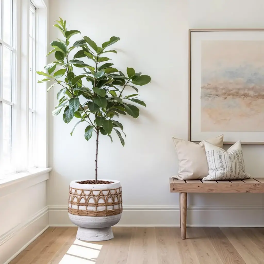 This round planter is an excellent addition for those who appreciate both nature and art, showcasing a unique charm that enhances any space. Crafted from high-quality magnesium oxide, it offers impressive sturdiness and durability. The pot features a sleek white body adorned with elegant brown decorations, perfectly marrying classic minimalist design with contemporary aesthetics. Its surface boasts a woven texture design that draws inspiration from the freedom and romance of the Bohemian style. Designed thoughtfully, the planter includes a drainage hole accompanied by a matching plug, ensuring optimal conditions for plant growth while serving as a striking decorative piece. Whether you choose to place it in your indoor living room or on an outdoor patio, this planter effortlessly adds a refreshing touch of greenery, enhancing your environment with vitality and style.