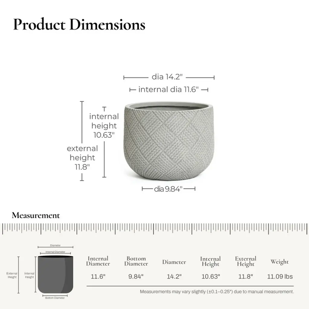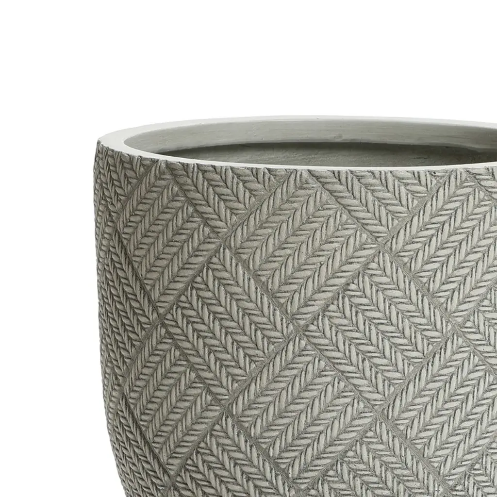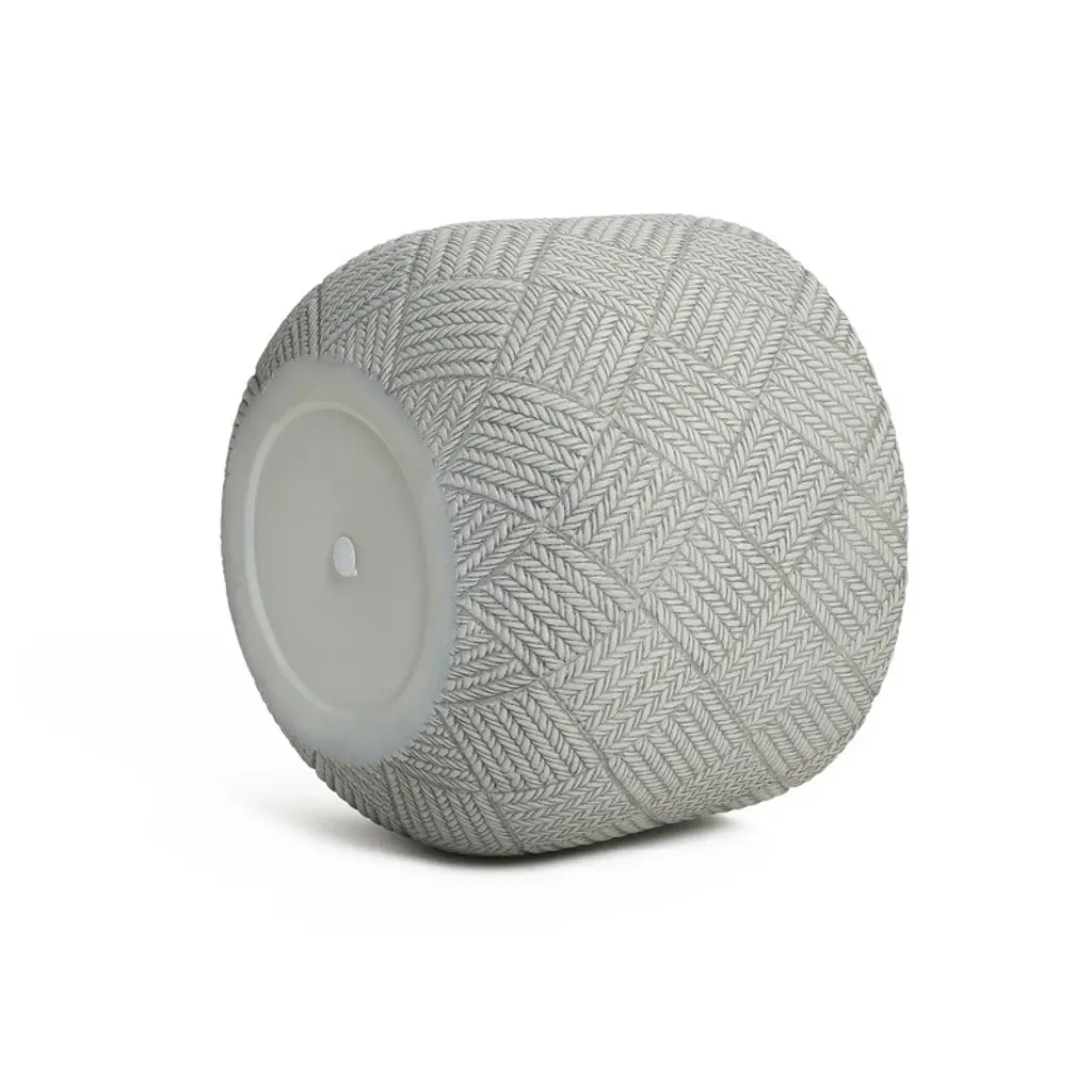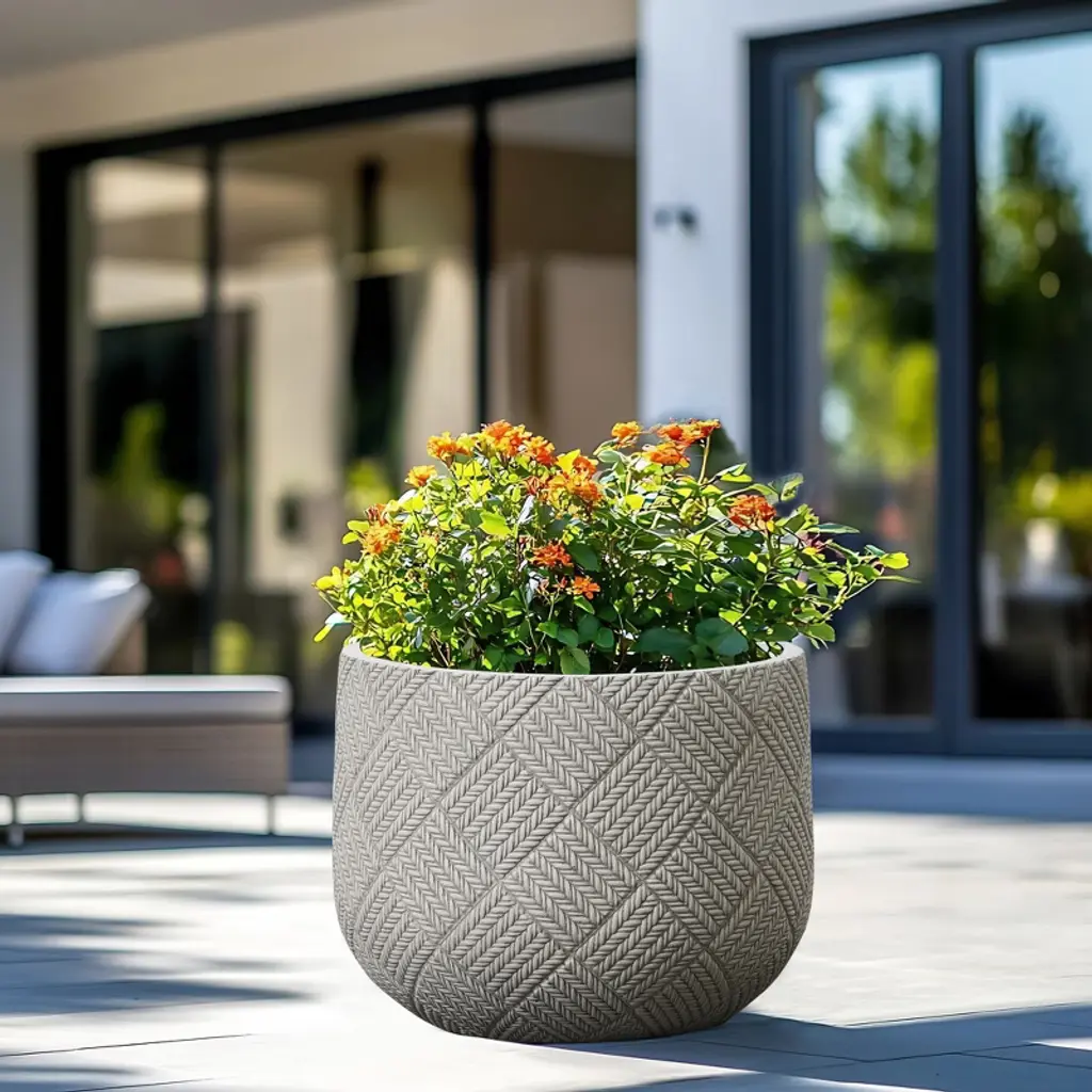 This elegant round planter features a timeless misty gray glen pattern that embodies a modern minimalist aesthetic with its soft, warm tones. The planter's body is adorned with a unique woven texture, showcasing staggered lines intricately woven into a delicate grid-like design, which enhances its overall visual appeal. Crafted from high-quality MgO material, this planter offers durability while being lightweight for easy handling. Additionally, the integrated drainage hole at the bottom simplifies plant care, making it a practical choice. Whether placed indoors in a living room or outdoors on a patio or porch, this planter seamlessly elevates the style of any living space.