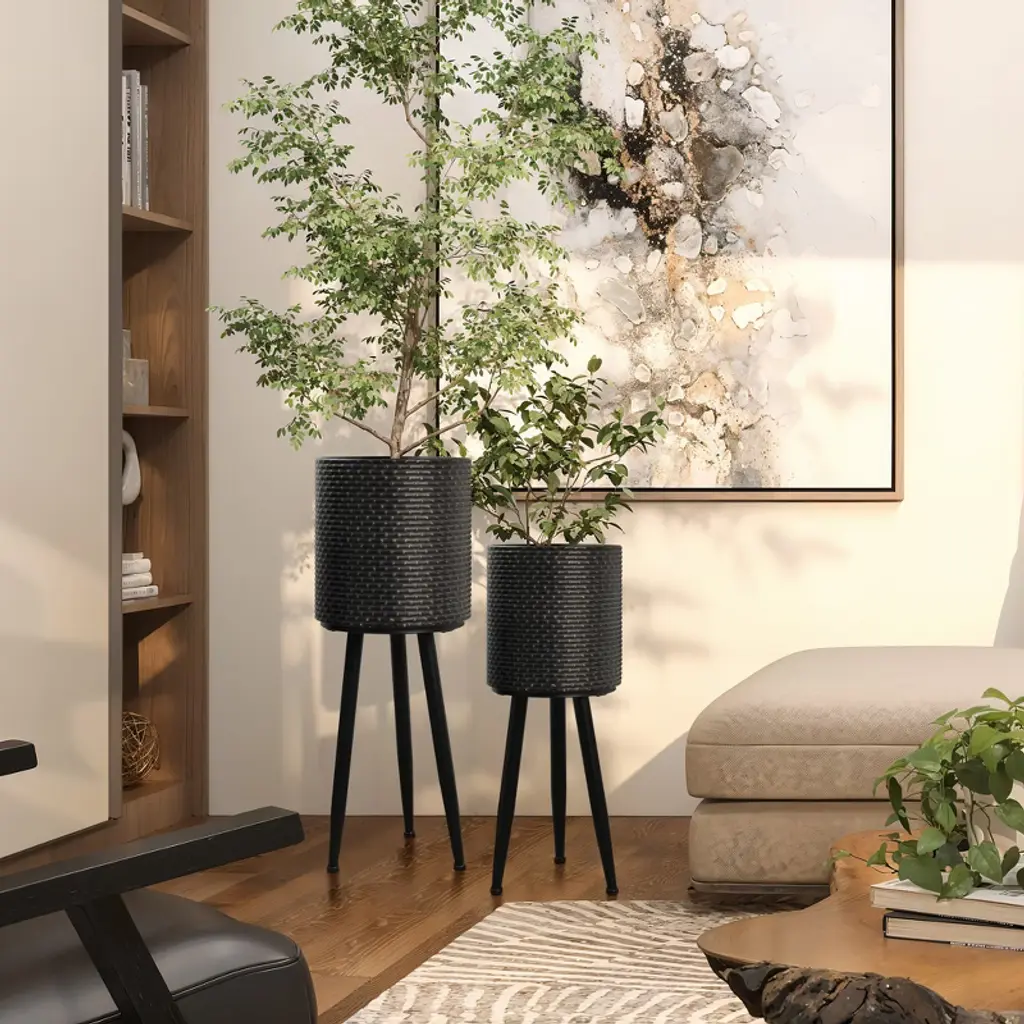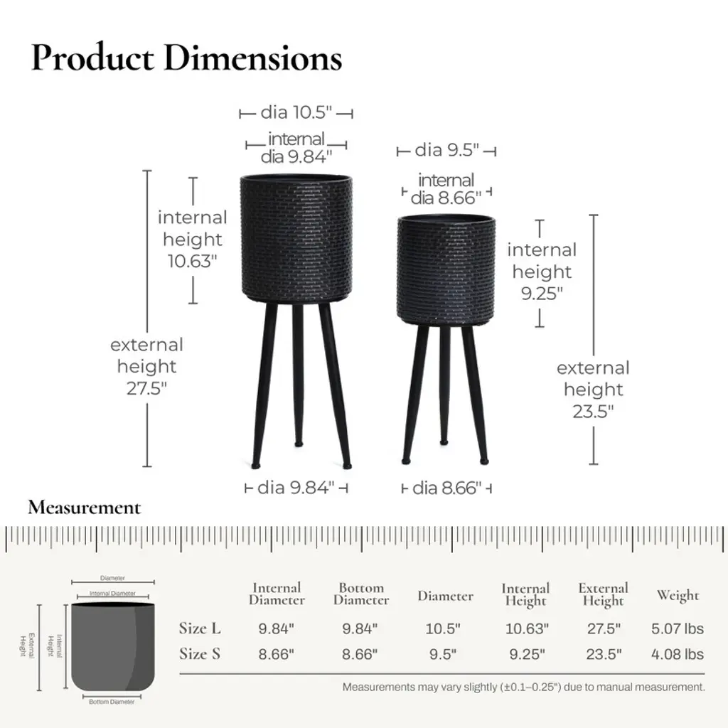 This versatile 2-piece pot planter set offers an attractive way to showcase your plants. The stylish metal cachepots feature a hammered and distressed black finish, beautifully complemented by a matching tripod stand. Designed to fit seamlessly on their stands, both the large and small planters share an identical design, enhancing any decor. These cachepots provide a convenient solution for transitioning your outdoor planters indoors without the need for repotting. With their unique industrial-modern aesthetic, they are ideal for spaces like living rooms, bedrooms, or entryways. While these elegant metal pots are perfect for indoor use, it's important to note that they are intended as cachepots and are not waterproof. Elevate the look of your greenery with this chic planter set!