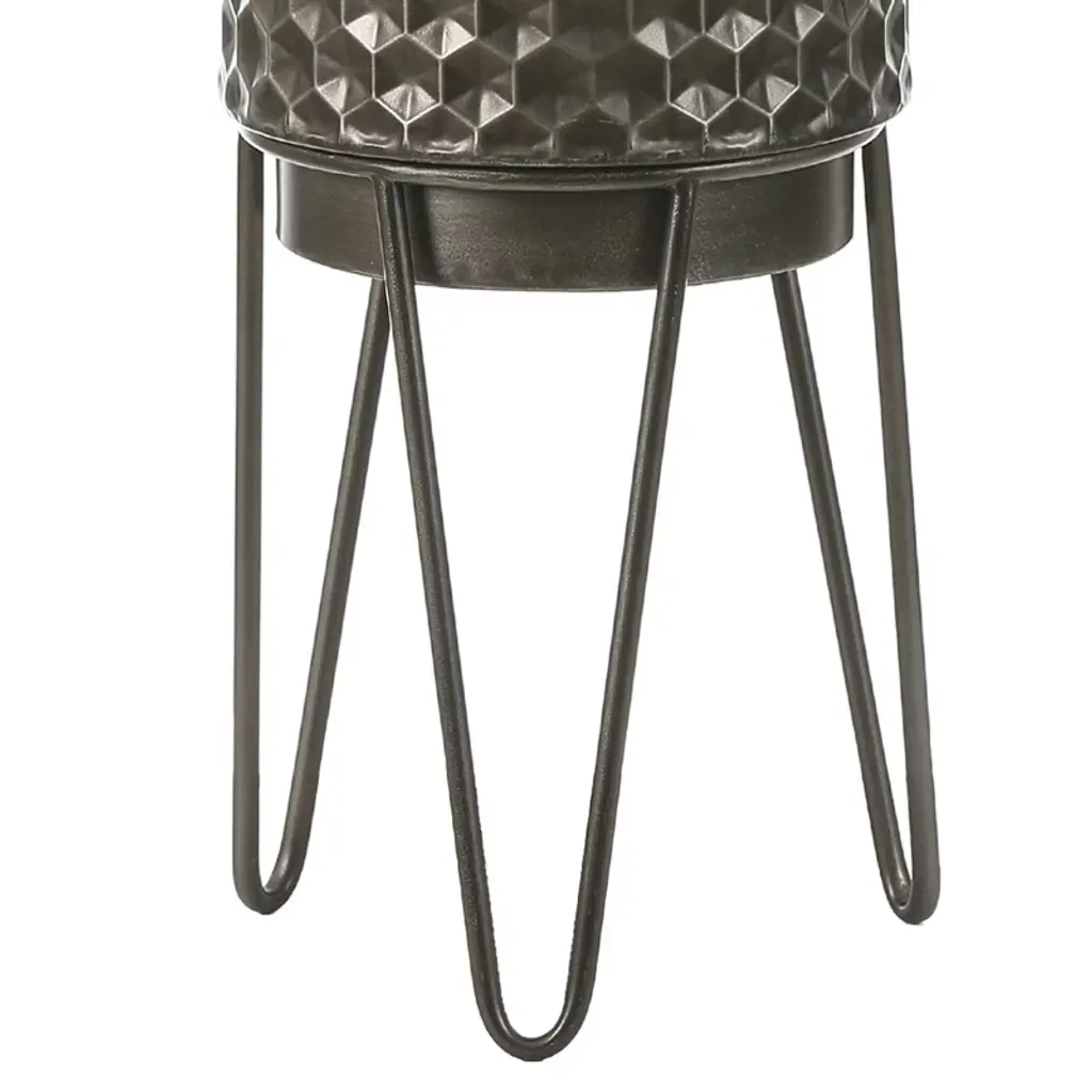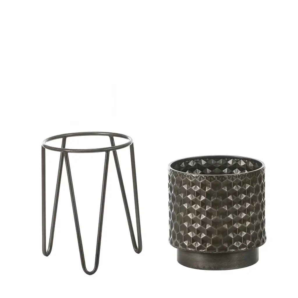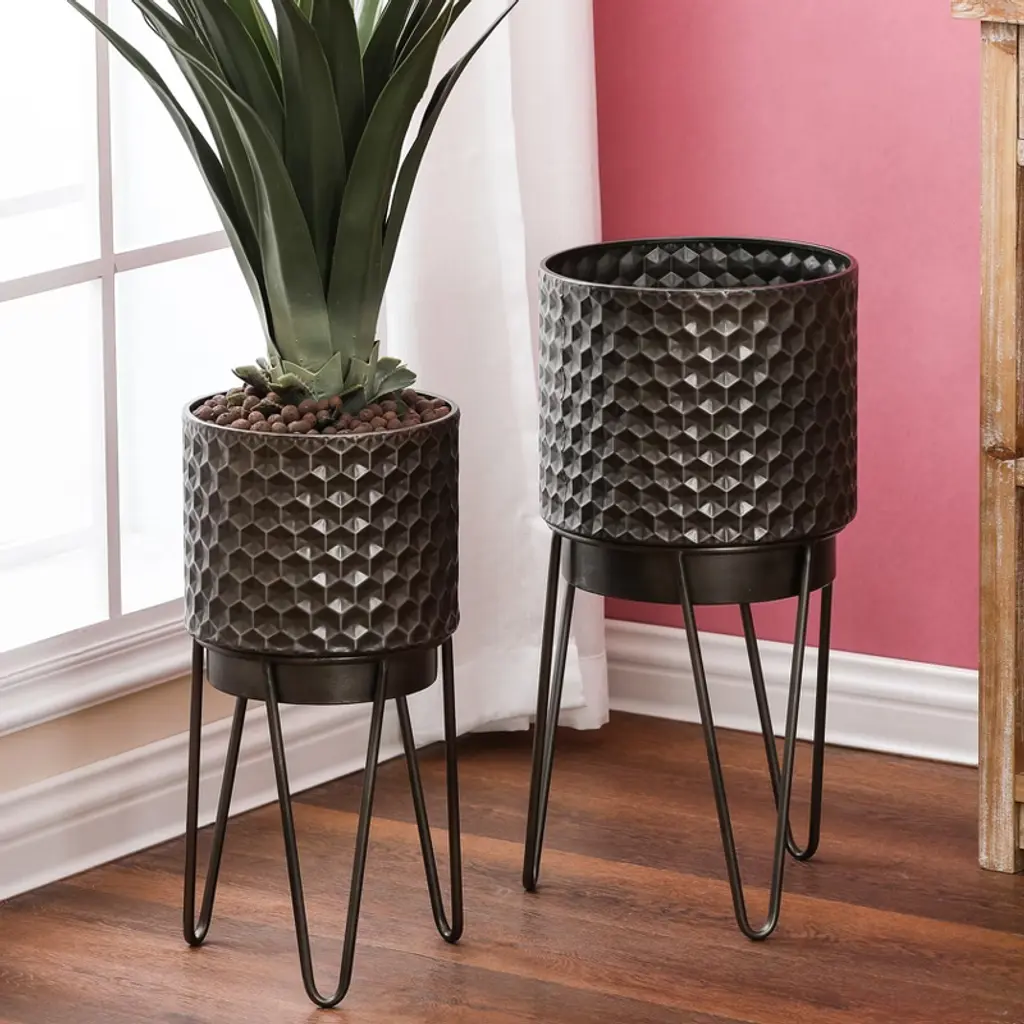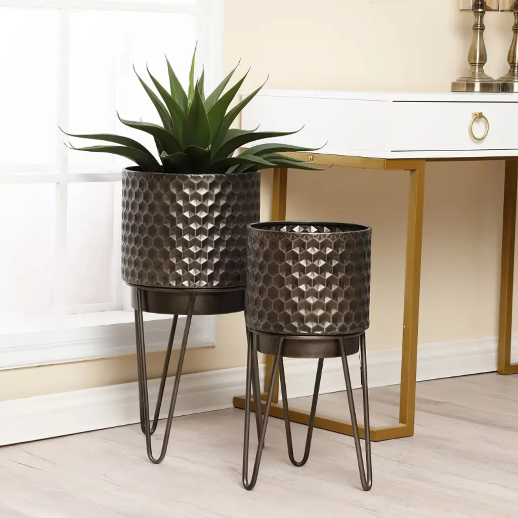 Enhance your indoor space with this set of two brown honeycomb metal cachepot planters, designed to bring a modern-industrial charm to your home. Inspired by the intricate beauty of traditional honeycomb patterns, these planters feature a sleek, geometric design with a contemporary twist, adding depth and style to any décor. Each metal container sits atop a chic, open-frame base with V-shaped brown legs, creating a bold yet refined aesthetic that effortlessly blends sophistication with functionality. Whether placed in a living room, office, bedroom, or entryway, these planters make a stunning focal point, drawing admiration from guests and family alike. Perfect for indoor use, these cachepot planters provide an elegant home for your favorite greenery. Simply place them in a hall, foyer, or any stylish nook, fill them with lush plants, and enjoy the refreshing ambiance they create. Whether used as decorative accents or functional plant holders, these versatile, eye-catching pieces elevate any space with their modern appeal and rich, earthy tones. Make your home feel effortlessly sophisticated and inviting with this set of brown honeycomb metal planters—where industrial design meets timeless elegance!