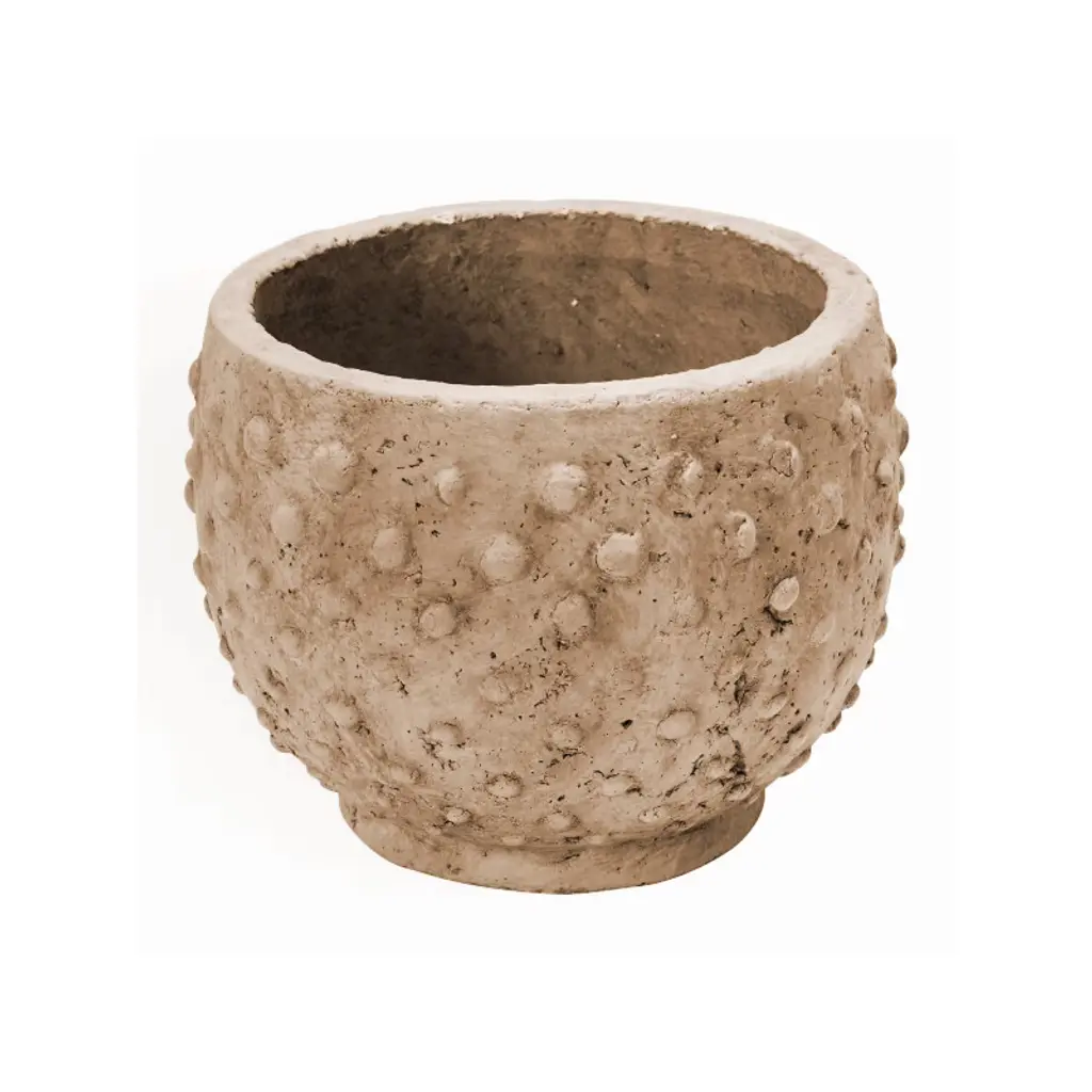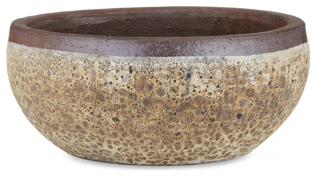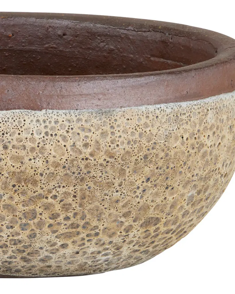 The Lyra Beige Small Planter is a bowl-shaped garden planter with a surface that looks like it has fissures and craters in it thanks to the incredible reactive cream glazing that was applied after the vessel was fired. There is a mottling on the surface of the tan planter that brings it an incredible texture. The Lyra has a drain hole, though the vessel does not come with a plug.