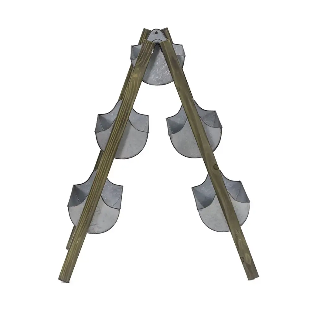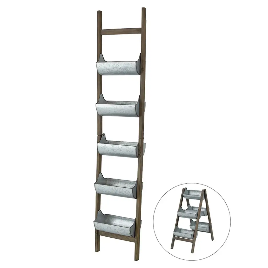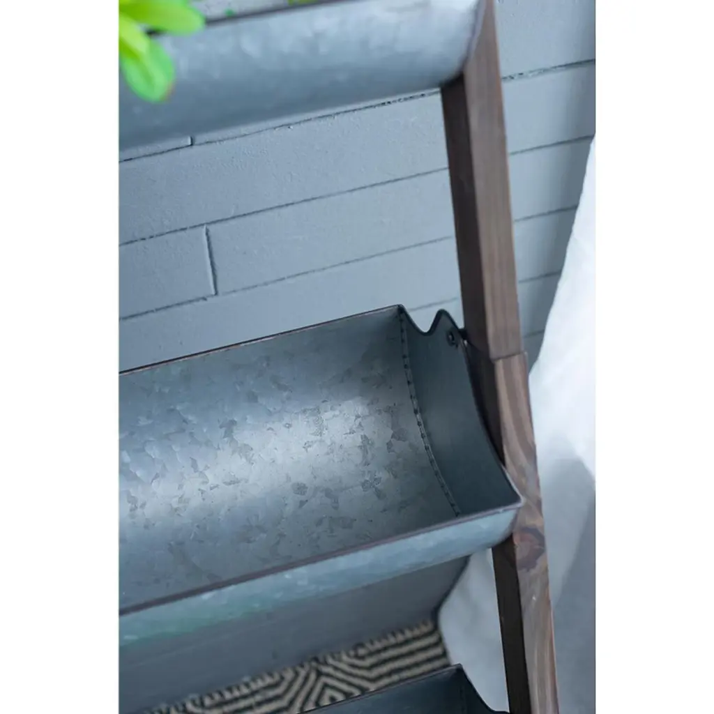 Display and care for your favorite floral accents or welcome your faux flowers to their new home with this stylish vertical garden. The five galvanized buckets hang from the ladder-style wood frame. It boasts hues of grey and brown, and is lightly distressed for a touch of rustic appeal.