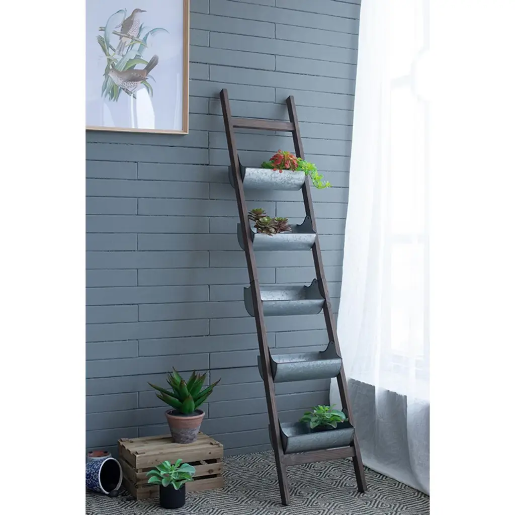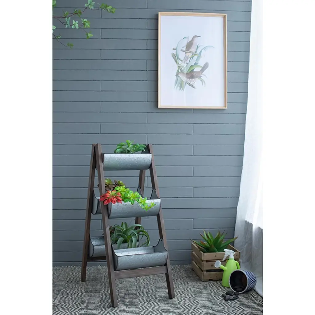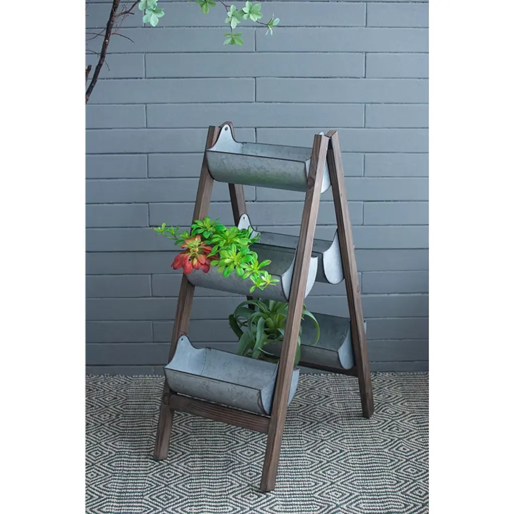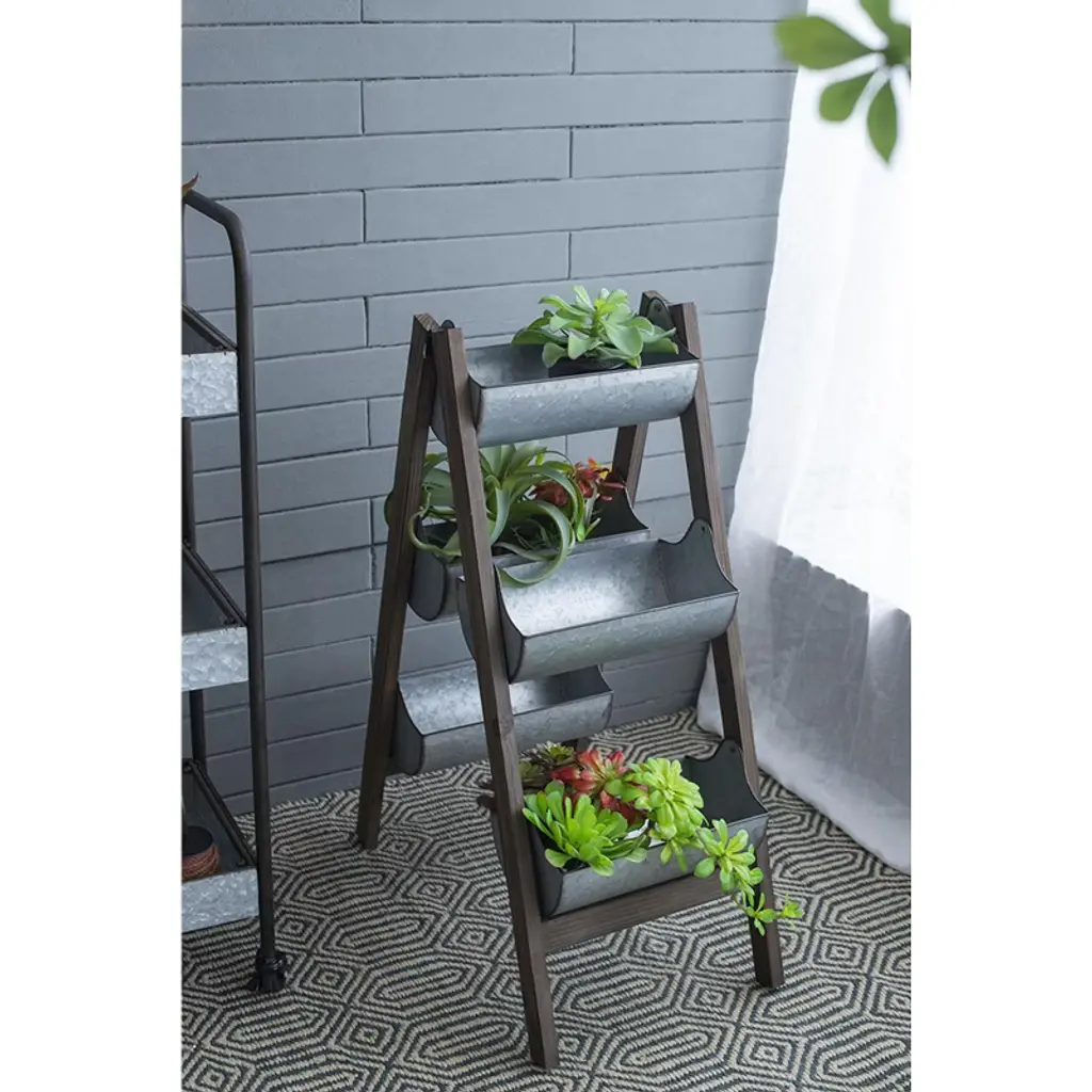 Display and care for your favorite floral accents or welcome your faux flowers to their new home with this stylish vertical garden. The five galvanized buckets hang from the ladder-style wood frame. It boasts hues of grey and brown, and is lightly distressed for a touch of rustic appeal.