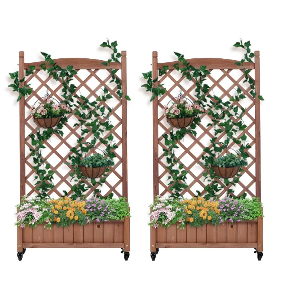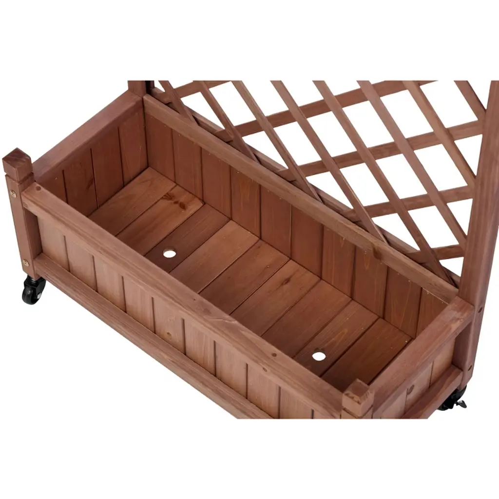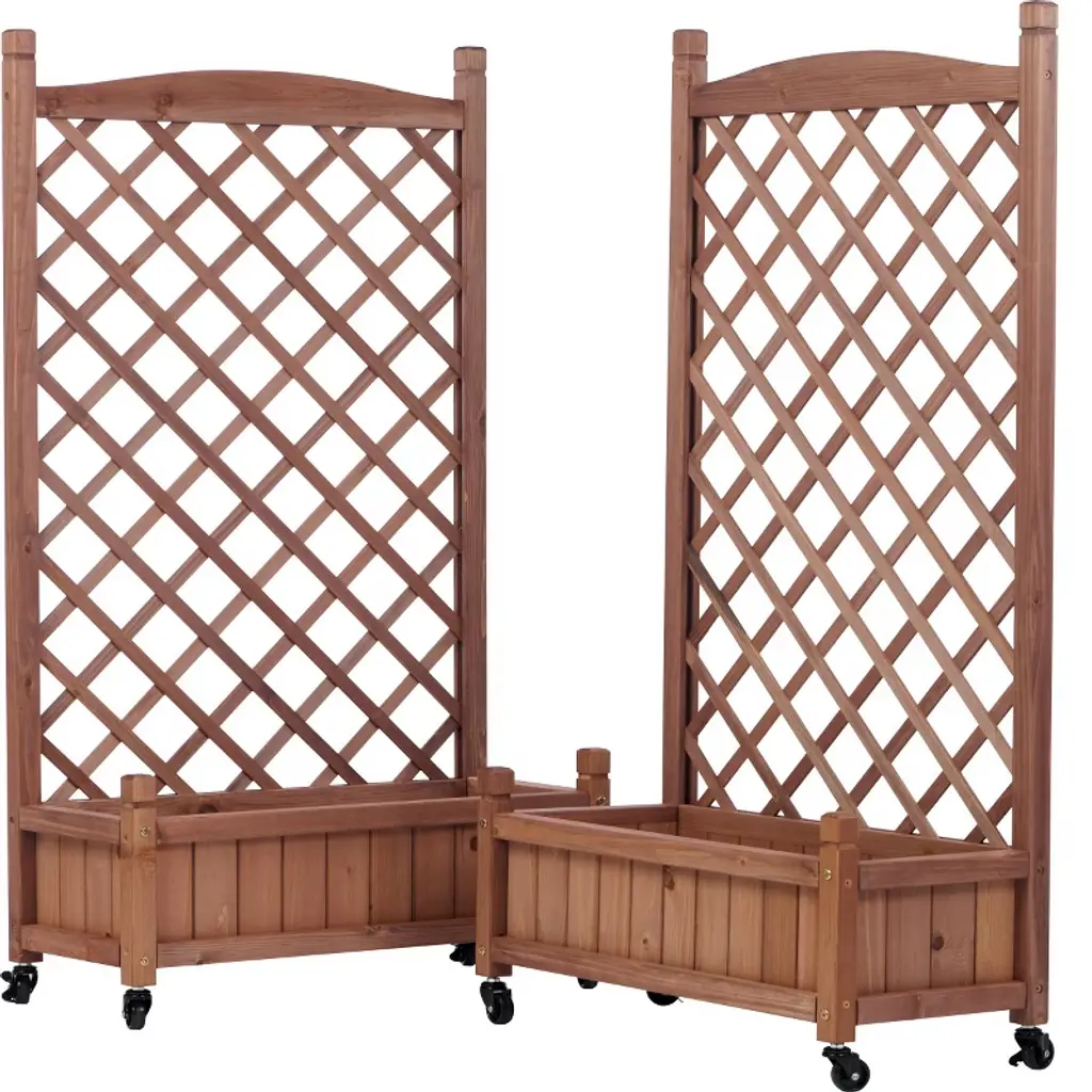 This 2-piece wooden planter set (11"L x 25"W x 42.3"H each) features built-in trellises for climbing plants/vegetables and wheeled bases for easy mobility. Made of natural wood with 0.8 cu. ft. capacity per box, it includes drainage holes for healthy plant growth and requires only 20-30 minutes to assemble.