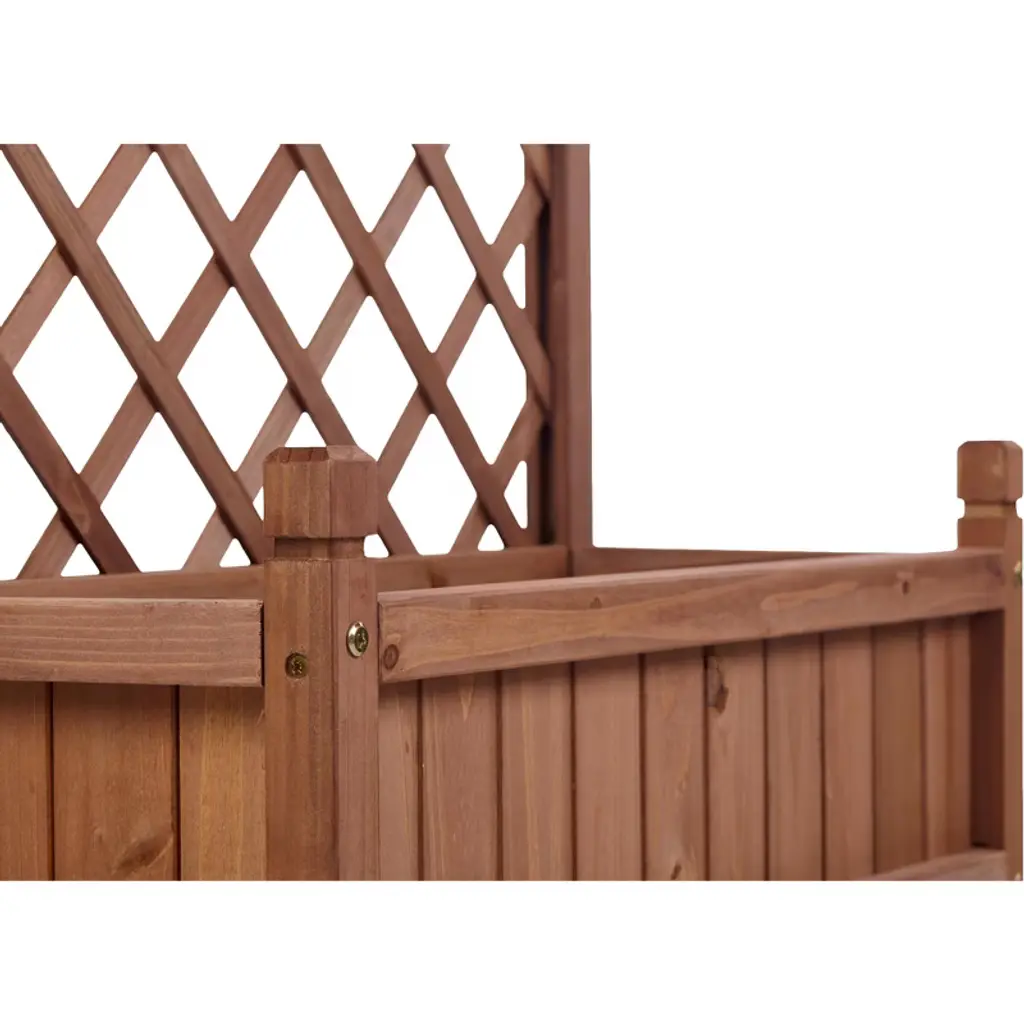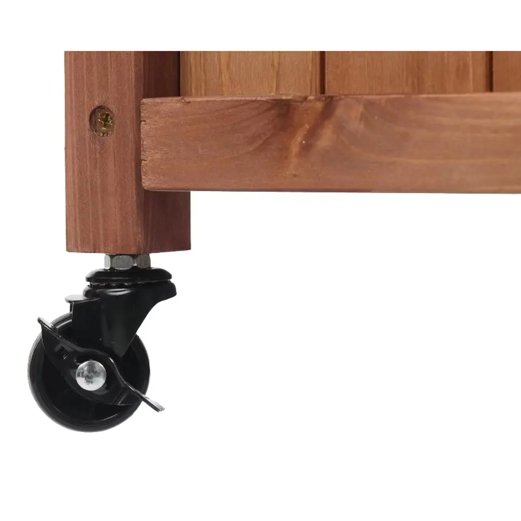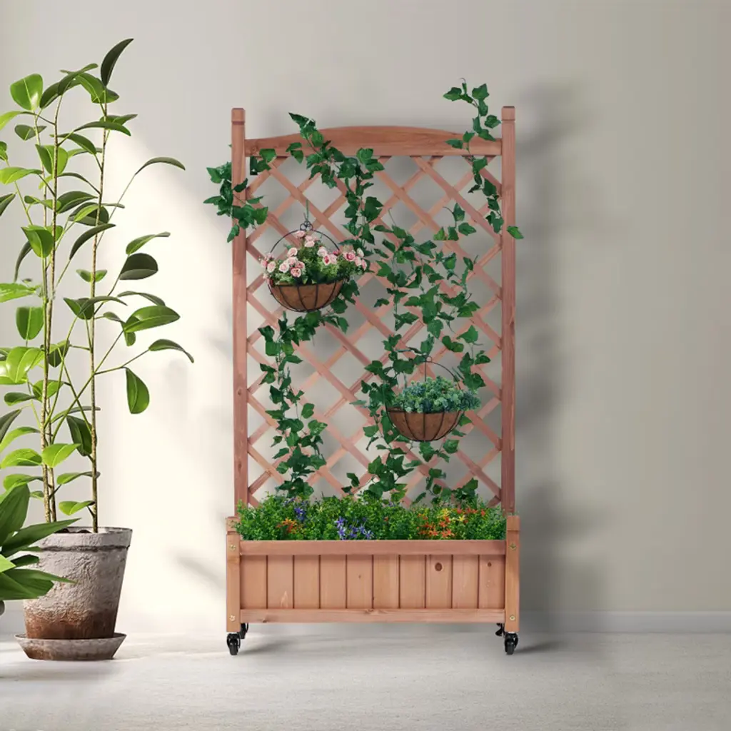 This 2-piece wooden planter set (11"L x 25"W x 42.3"H each) features built-in trellises for climbing plants/vegetables and wheeled bases for easy mobility. Made of natural wood with 0.8 cu. ft. capacity per box, it includes drainage holes for healthy plant growth and requires only 20-30 minutes to assemble.
