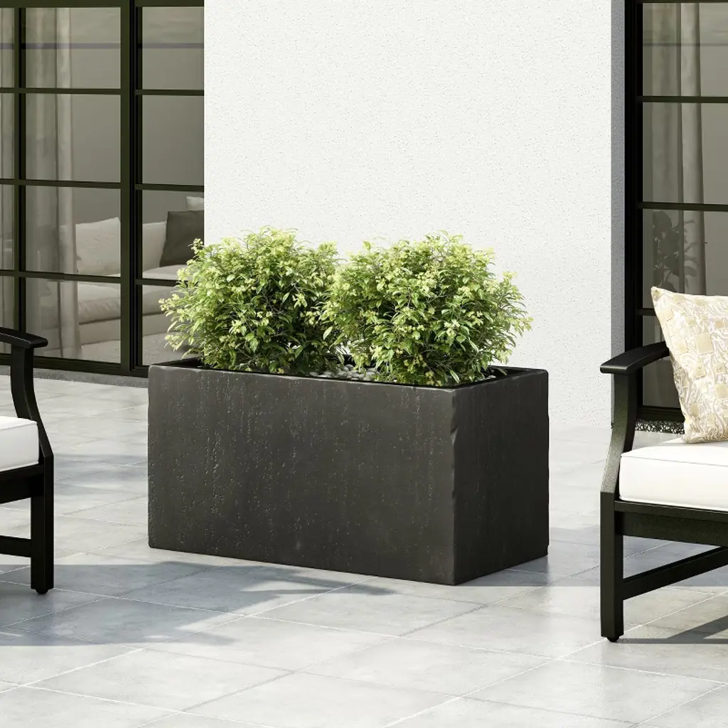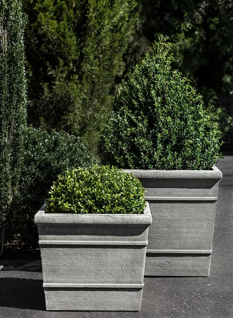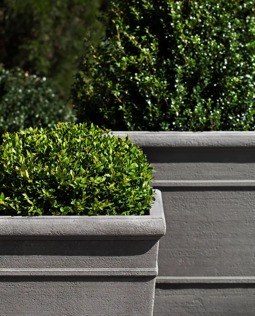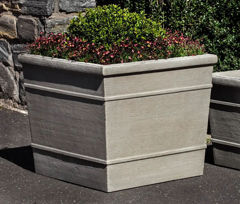 A clean, cast-stone square platner with a greystone finish. This listing in for the large-sized planter. * greenery is for display purposes only and no greenery will be included with the purchase.