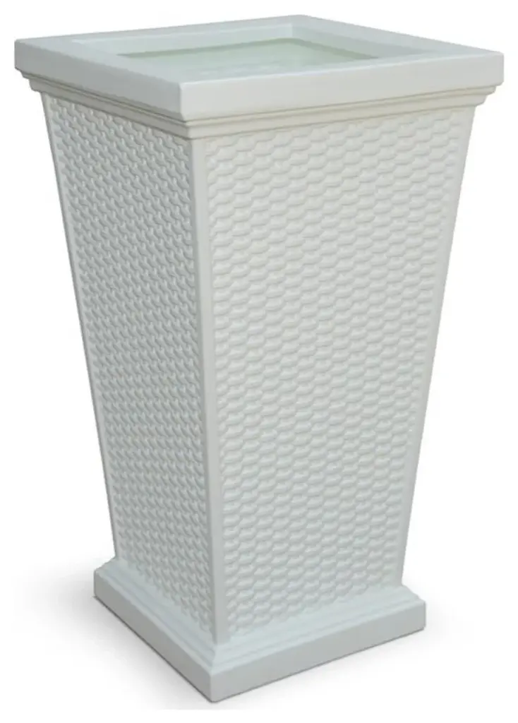 The Wellington Planter is the answer to all your wicker design aspirations! Its ability to maintain a timeless aesthetic while providing you with the nostalgia of yesteryear eclectic design, makes this planter a must have for anyone looking to make a statement. These Polyethylene planters have built-in UV inhibitors which allow for a long-lasting, fade-free performance. They are weatherproof and have an ultra-tough construction. It is available in Black, Espresso and White.Features: • Beautiful wicker design adds a charming touch to any patio or deck. • Mayne products are made with 100% high-grade polyethylene resin. • The resin used in these planters have built-in UV inhibitors that ensure it does not fade easily. • Unlike wood planters that need regular maintenance, our planters look like wood without any effort. • Mayne offers a 15-year residential warranty or a 5-year commercial warranty on this planter. • Mayne products are proudly designed in Canada and made in the USA.Specifications: • Color/Finish: White • Commercial/Residential: Both • Included: Instructions, Fill port plug • Material: Polyethylene Resin Plastic • Product Dimensions: 28"H x 16"W x 16"D • Product Weight: 10 lbs • Warranty: (Residential) 15 years; (Commercial) 5 years