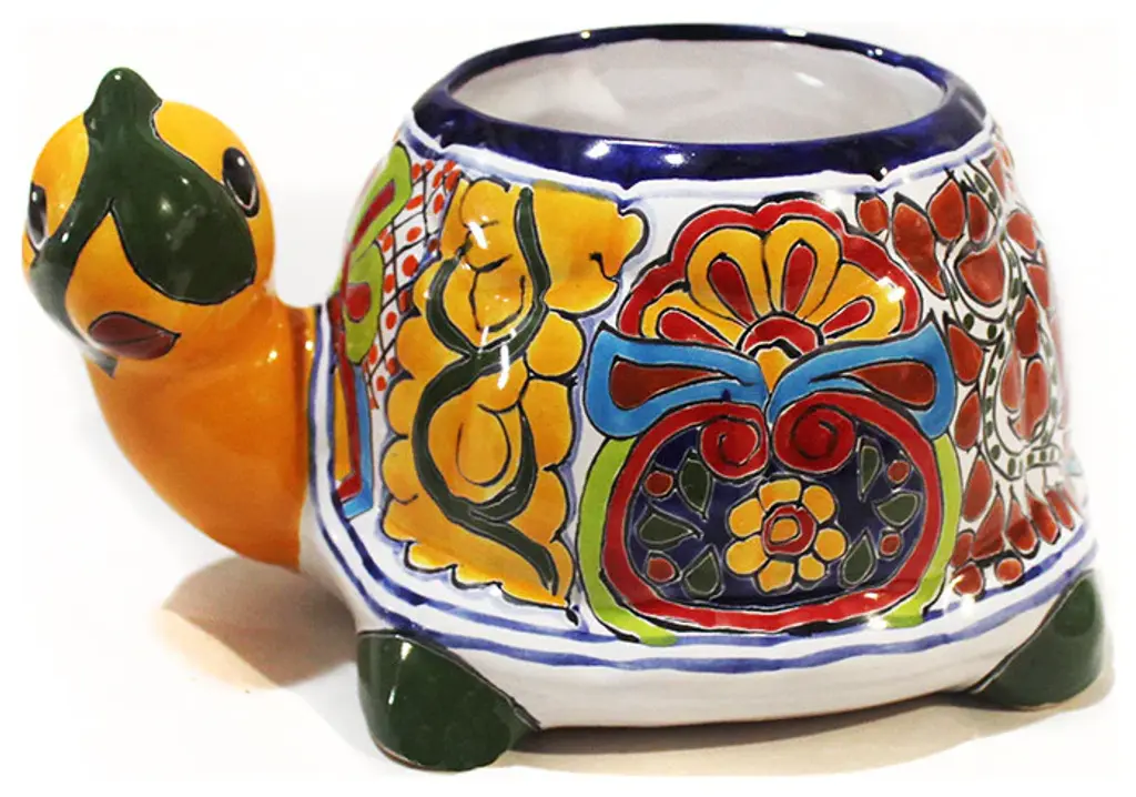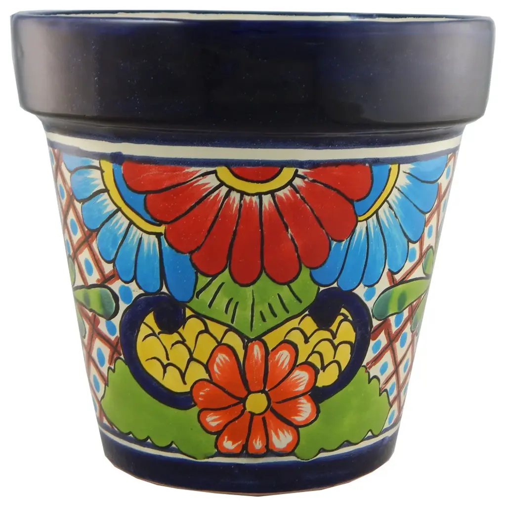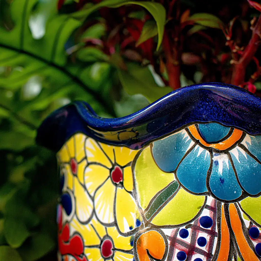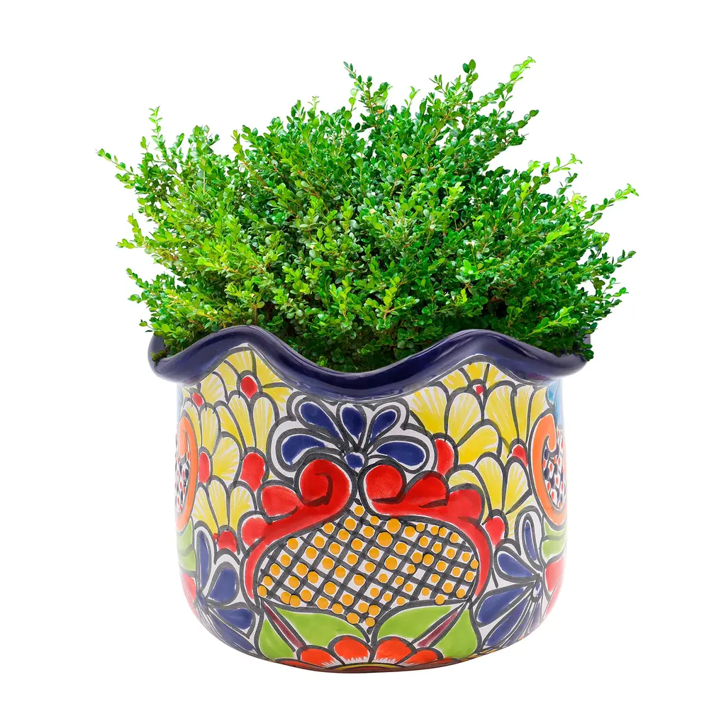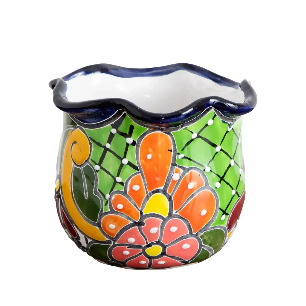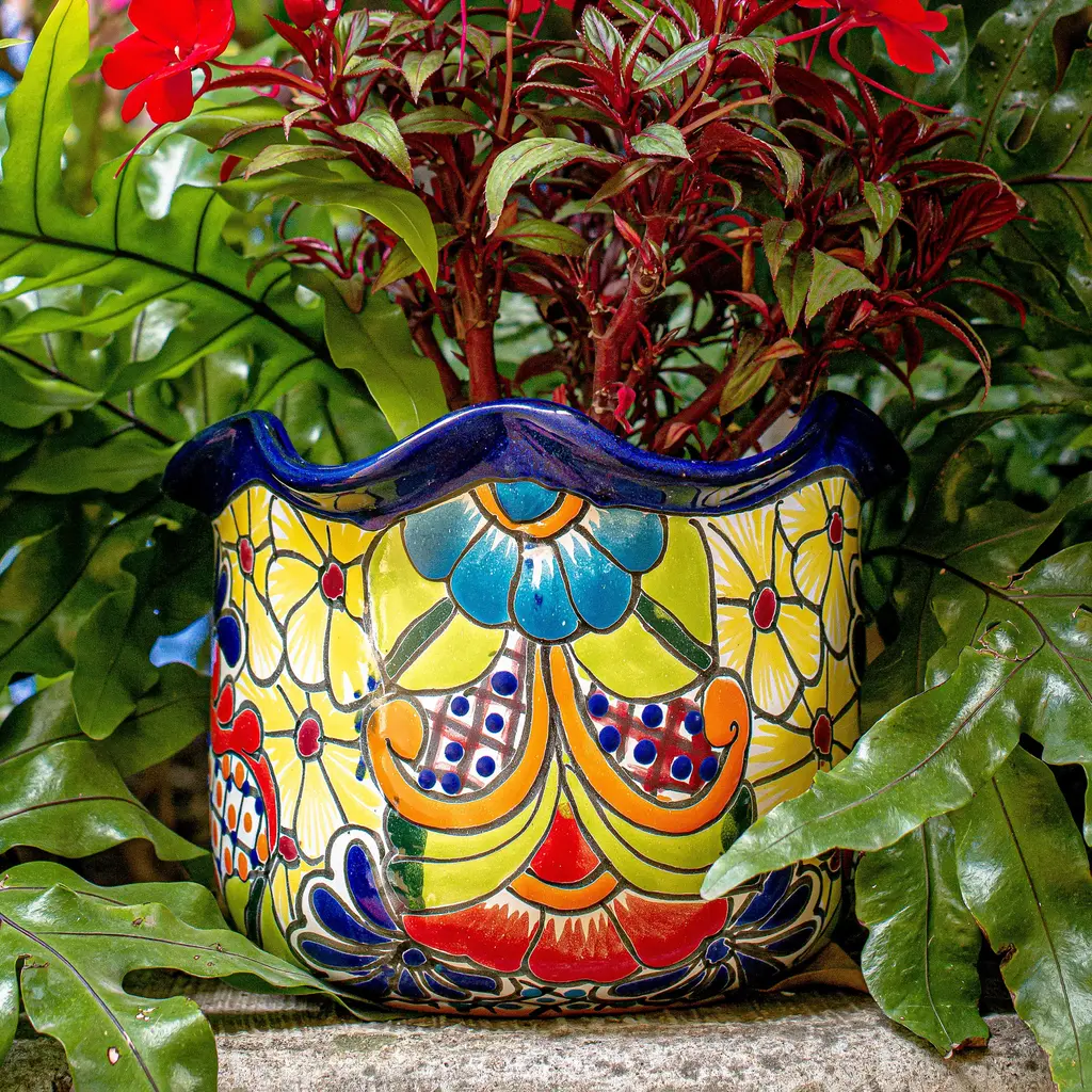 Bring quality craftsmanship to your home with an authentic Talavera planter. Crafted in Mexico, this planter is created in traditional Talavera style with hand-thrown ceramic clay. With its ripple rim and bright color, this planter is perfect for growing herbs and more. The glaze coating is applied by hand and seals in the intricate artistry and gives the planter a wonderful shine, making it safe for display indoors or out. Feature this planter in your living room, entryway, porch, deck and more. The hand-painted colors perfectly complement greenery, florals or neutral spaces in need of a colorful upgrade. Bottom drainage hole included.