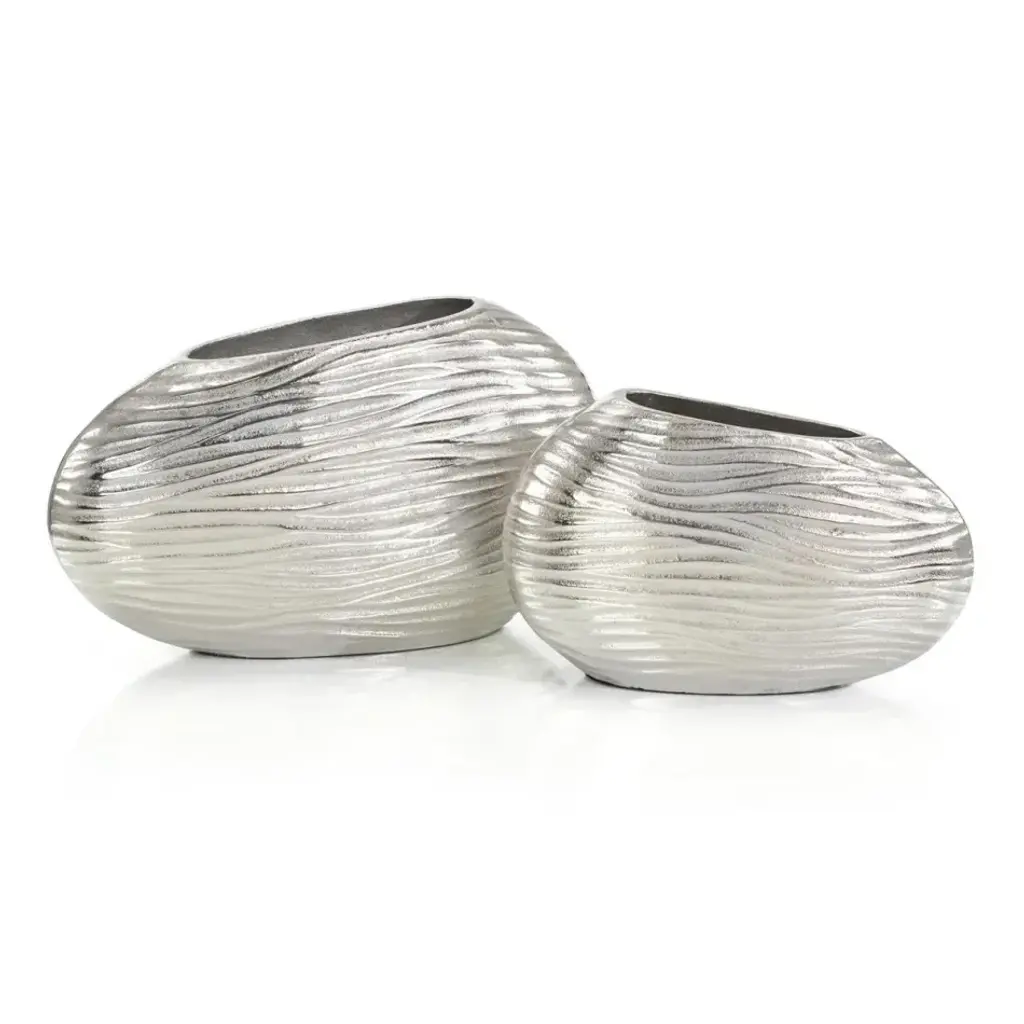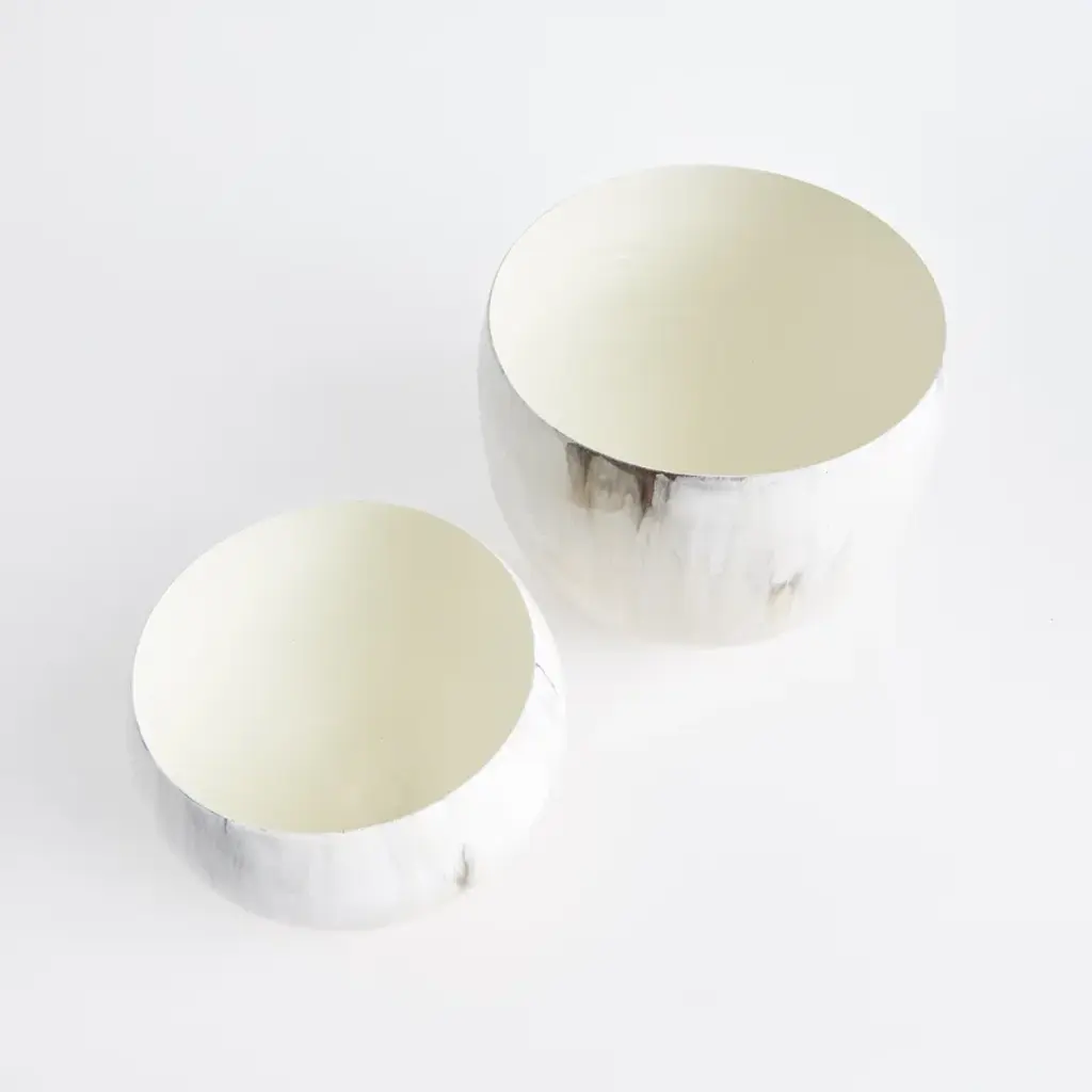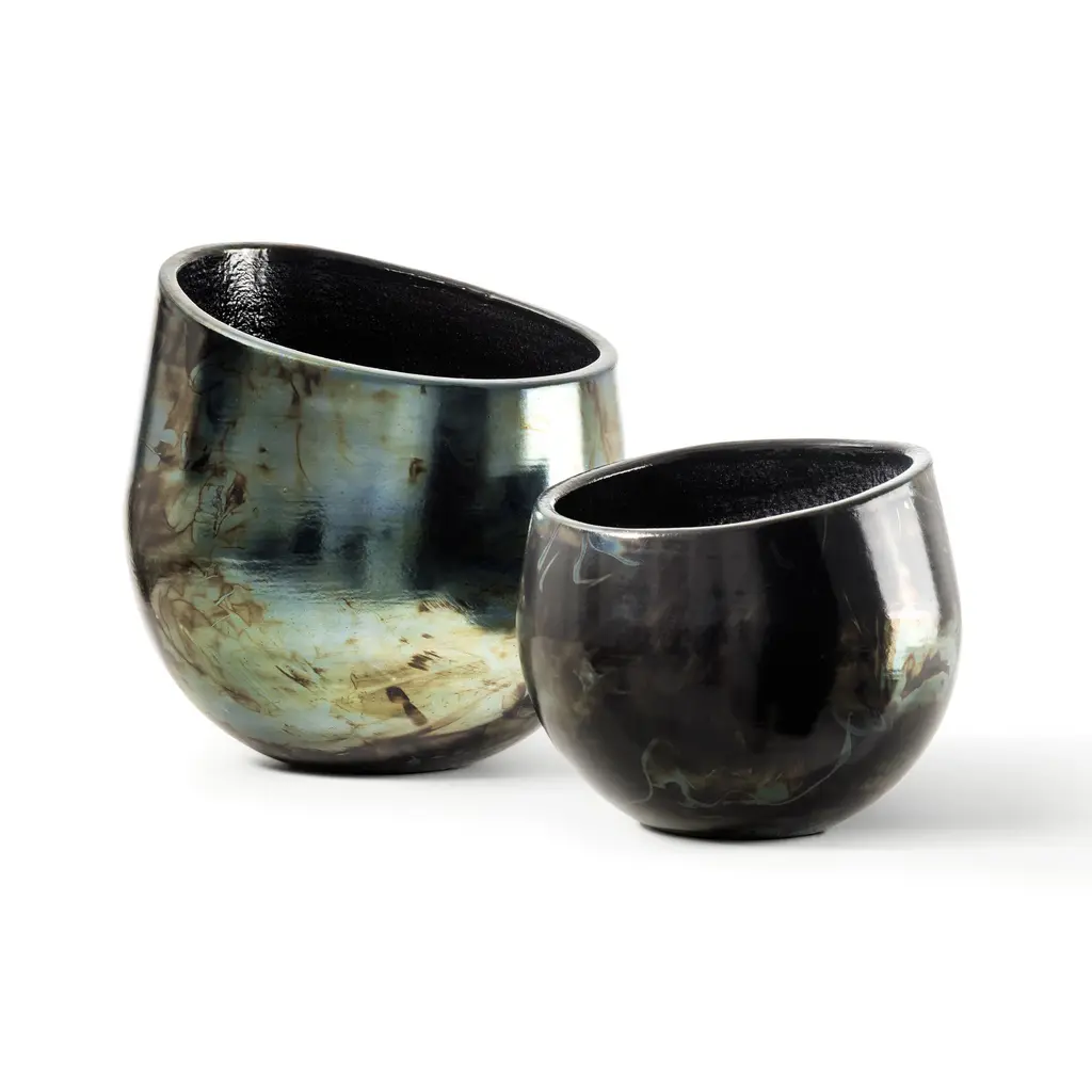 In a clever use of enameled iron, these lightweight cachepots are painted by hand. With a creamy mocha palette inspired by a latte, with layers of milky froth and coffee tones swirling, it is modern artistry defined.