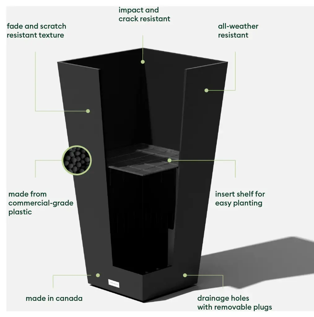 The Veradek Midland Planter, with its perfect balance of design, durability, and convenience, featuring a unique, simple, sleek, and modern look in all settings. Featuring an elegant flat finish and a modern, sleek square bowl design, the Midland is ideal as a patio accent or flanked along an entrance wall. from high-density plastic (HDPE), these Veradek planters are extremely durable and designed to withstand the elements - winter or summer. Midland planters come equipped with a removable shelf - this provides the user the versatility of fully filling the planter with soil or using an interchangeable plant insert. These planters are frost resistant for colder climates with flexible, impact resistant, and sturdy yet lightweight design, making it perfect for your indoor and outdoor decor.