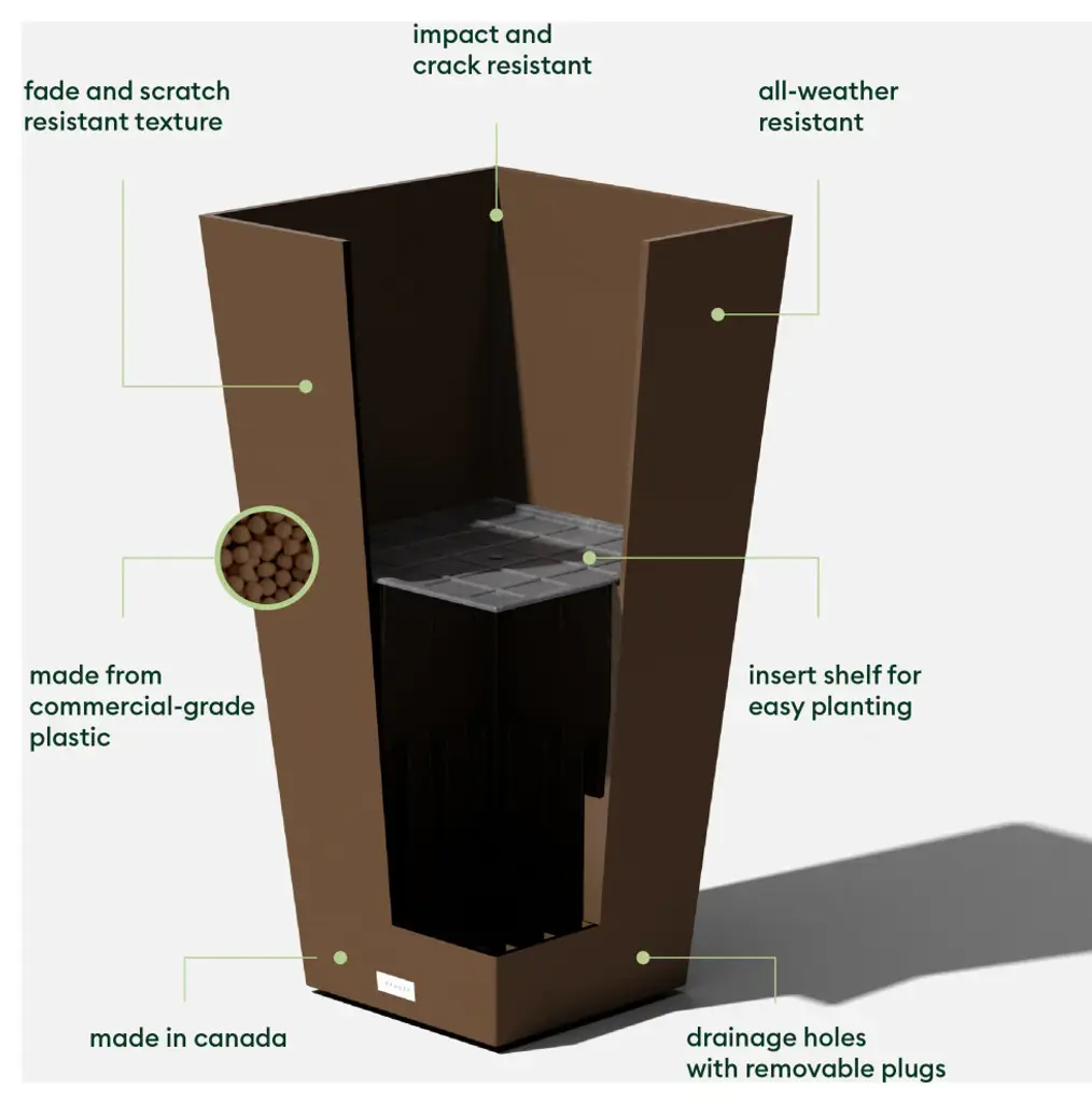 The Veradek Midland Planter, with its perfect balance of design, durability, and convenience, featuring a unique, simple, sleek, and modern look in all settings. Featuring an elegant flat finish and a modern, sleek square bowl design, the Midland is ideal as a patio accent or flanked along an entrance wall. from high-density plastic (HDPE), these Veradek planters are extremely durable and designed to withstand the elements - winter or summer. Midland planters come equipped with a removable shelf - this provides the user the versatility of fully filling the planter with soil or using an interchangeable plant insert. These planters are frost resistant for colder climates with flexible, impact resistant, and sturdy yet lightweight design, making it perfect for your indoor and outdoor decor.