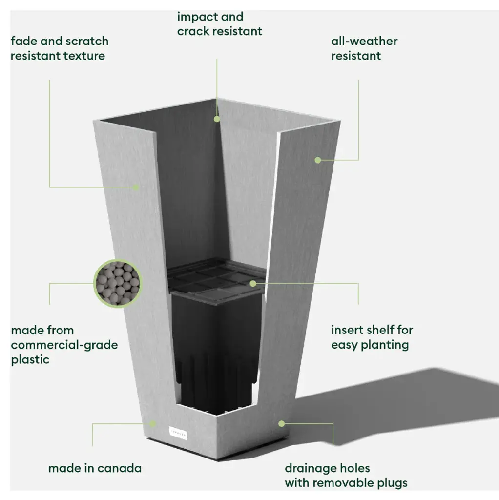 The Veradek Midland Planter, with its perfect balance of design, durability, and convenience, featuring a unique, simple, sleek, and modern look in all settings. Featuring an elegant flat finish and a modern, sleek square bowl design, the Midland is ideal as a patio accent or flanked along an entrance wall. from high-density plastic (HDPE), these Veradek planters are extremely durable and designed to withstand the elements - winter or summer. Midland planters come equipped with a removable shelf - this provides the user the versatility of fully filling the planter with soil or using an interchangeable plant insert. These planters are frost resistant for colder climates with flexible, impact resistant, and sturdy yet lightweight design, making it perfect for your indoor and outdoor decor.