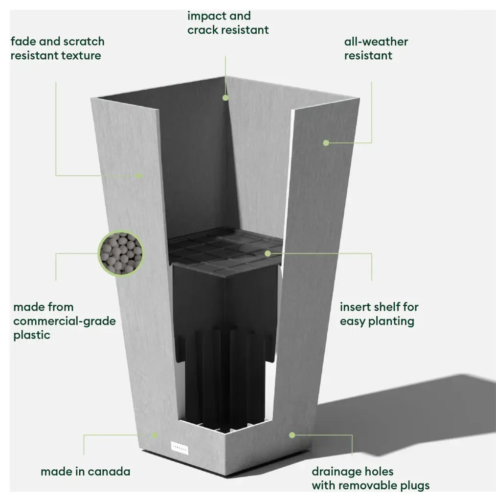 The Veradek Midland Planter, with its perfect balance of design, durability, and convenience, featuring a unique, simple, sleek, and modern look in all settings. Featuring an elegant flat finish and a modern, sleek square bowl design, the Midland is ideal as a patio accent or flanked along an entrance wall. from high-density plastic (HDPE), these Veradek planters are extremely durable and designed to withstand the elements - winter or summer. Midland planters come equipped with a removable shelf - this provides the user the versatility of fully filling the planter with soil or using an interchangeable plant insert. These planters are frost resistant for colder climates with flexible, impact resistant, and sturdy yet lightweight design, making it perfect for your indoor and outdoor decor.