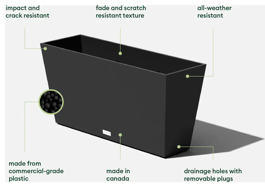 Whether it''s your room, your patio or the entrance wall of your home, the Veradek Midori Planter with its perfect balance of design, durability, and convenience features a subtle marbled finish and a modern trough tapered design which is the perfect fit to create privacy, be used as a room separator or fill out empty space. It has a unique finish, made from high grade polyethylene, which gives the planter its flexible, impact and crack resistant qualities. This lightweight pot is designed with patented plastic composite material to provide durability and withstand any kind of weather, specifically colder temperatures due to its frost resistant qualities and is specially treated to minimize fading. The Veradek outdoor patio and indoor decorative planters feature an optional drainage hole to help drain out water when used outdoors.