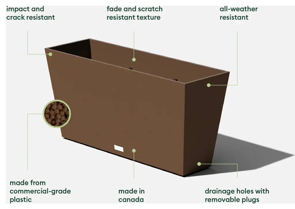 Whether it''s your room, your patio or the entrance wall of your home, the Veradek Midori Planter with its perfect balance of design, durability, and convenience features a subtle marbled finish and a modern trough tapered design which is the perfect fit to create privacy, be used as a room separator or fill out empty space. It has a unique finish, made from high grade polyethylene, which gives the planter its flexible, impact and crack resistant qualities. This lightweight pot is designed with patented plastic composite material to provide durability and withstand any kind of weather, specifically colder temperatures due to its frost resistant qualities and is specially treated to minimize fading. The Veradek outdoor patio and indoor decorative planters feature an optional drainage hole to help drain out water when used outdoors.