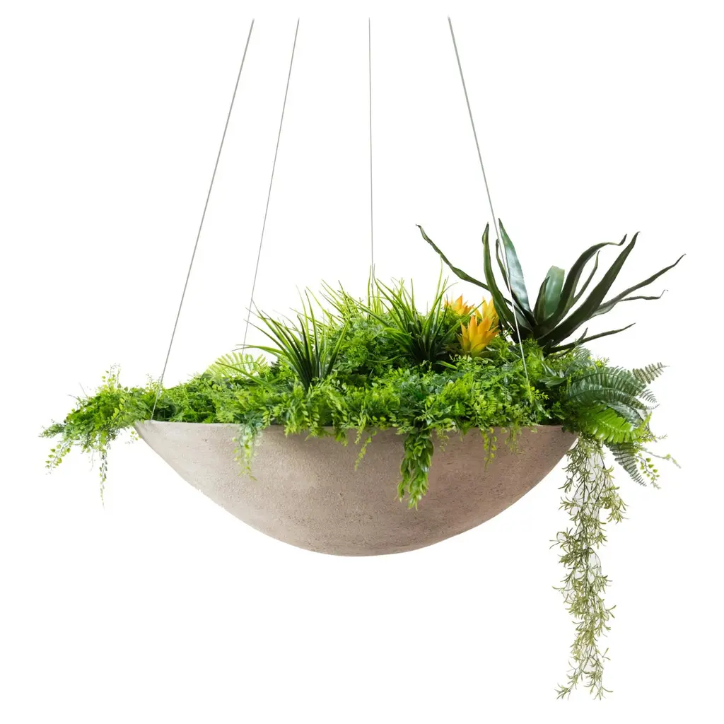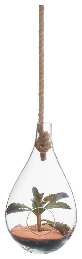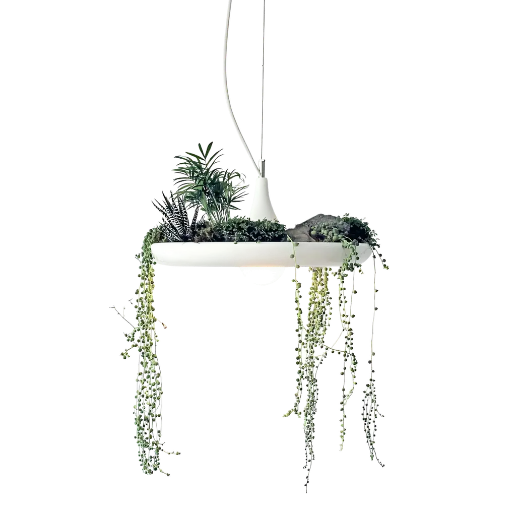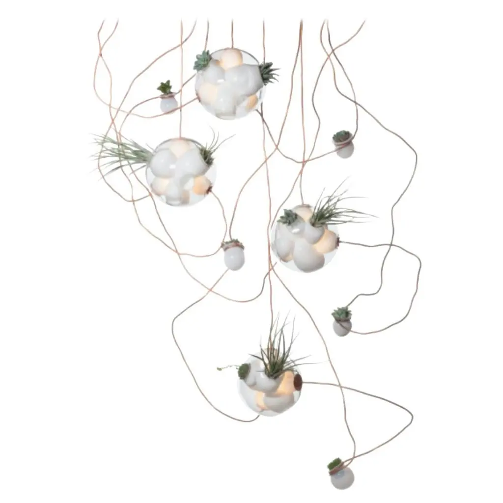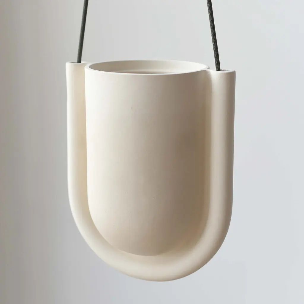It's a playful reimagination of a hanging planter. Has a minimal yet distinct look. Use to display succulents or other vining plants. Available in two colors.