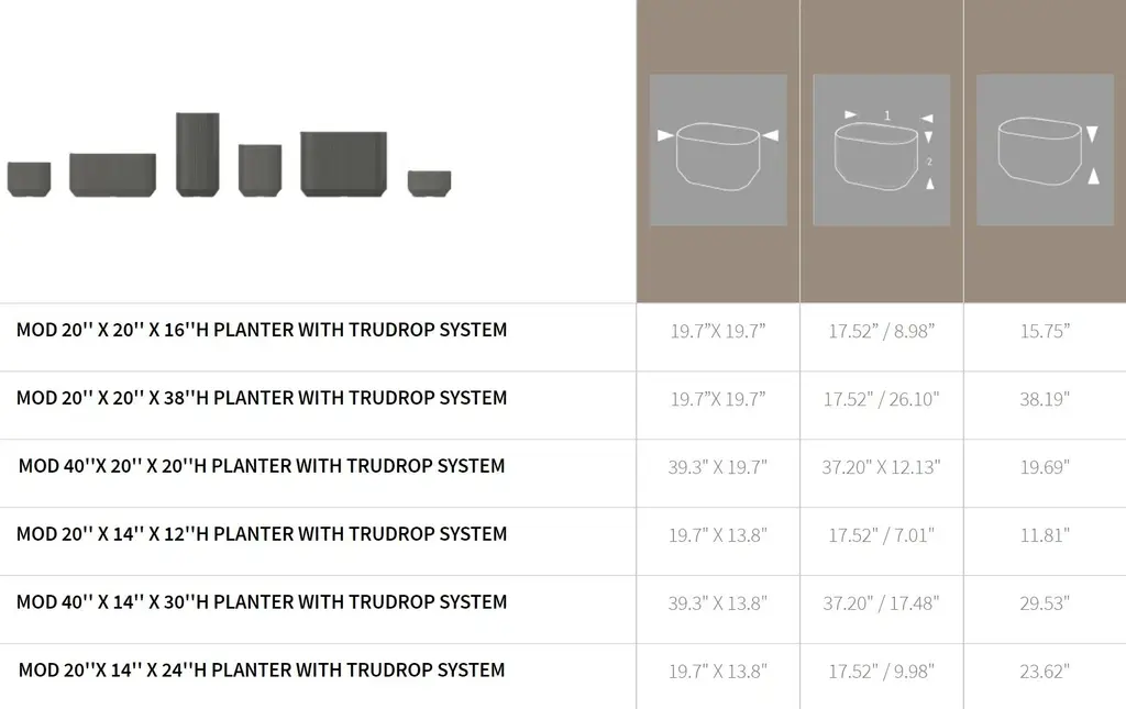 Designed with modularity in mind, our Mod self-watering planters can be stacked and combined in hundreds of configurations to create green dividers anywhere. Use them all in one color or combine colors to create your own design. The Mod planter features a built-in TruDrop One system, which is an innovative self-watering technology that reduces the need for watering for up to 6 weeks. Let the TruDrop system take care of an everyday chore. Then you can travel worry-free and have more time to enjoy the art of gardening.