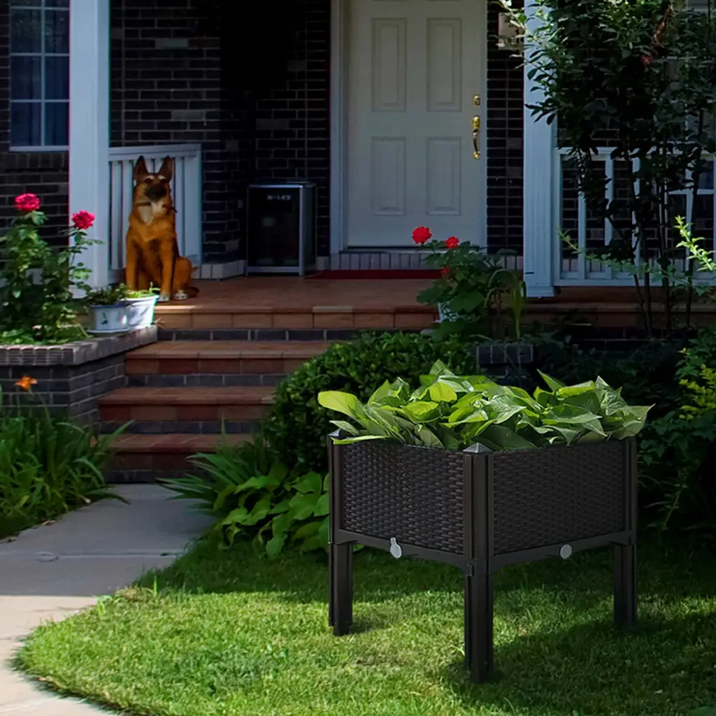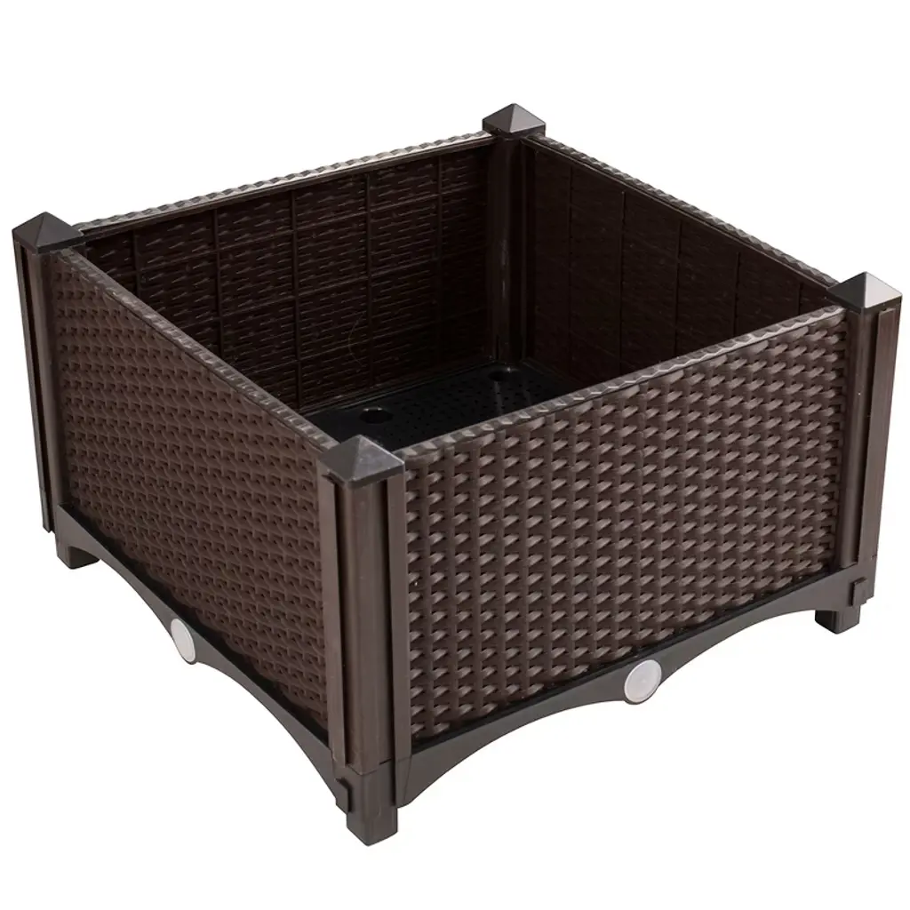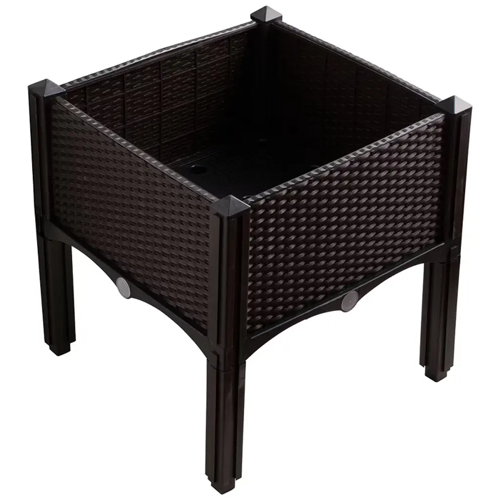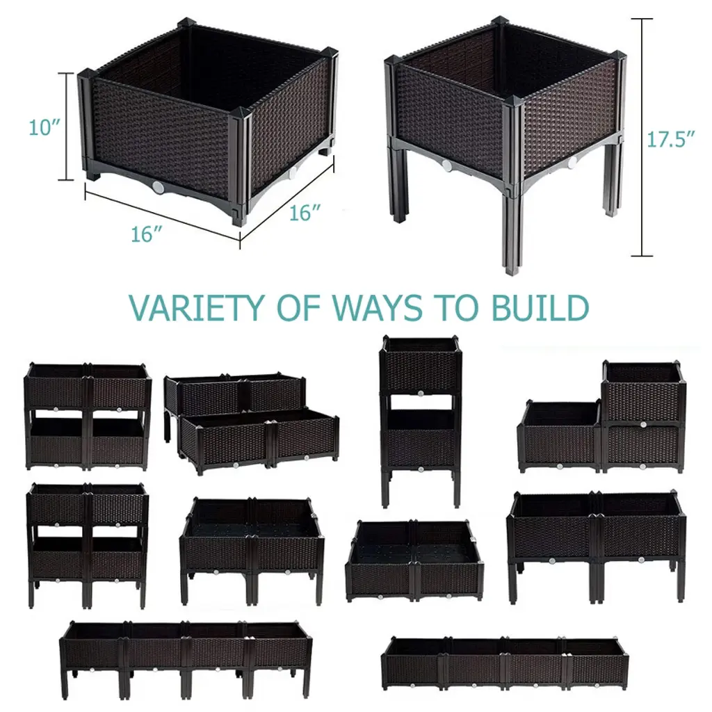 Modern Home Raised Planter kits are a new modular design that will simplify your gardening. Constructed of UV-Resistant High Density Polyethylene (HDPE), each kit includes 4 panels allowing you to quickly snap together a planter in minutes. Each kit comes with durable detachable legs allowing you to build custom sets. Put the legs below the planter to raise it up. Put the legs on top of the planter to double stack 2 planters. The HDPE material will not crack, rot, warp or splinter like traditional wooden planters. The walls will absorb heat from the sun and help retain warm temperature needed for your plants to develop. The planter box includes a self-watering bottom tray and drainage pores which creates a basin of reserve water at the bottom of the planter. This excess water reservoir allows roots to absorb water and thrive. Each side of the four sides of the box has a drain plug for draining the basin as needed. If not stacking, use the pyramid corner caps to finish the top of your planter with an elegant look. Offered in 2 colors, the Modern Home Raised Planters are stackable with interlocking supports allowing you to make unique configurations. Backed by the manufacturer 5 year limited warranty, each kit is durable and designed to last for years. Each standard single unit kit measures 16" x 16" x 10" without the legs and 17.5" tall with the legs.