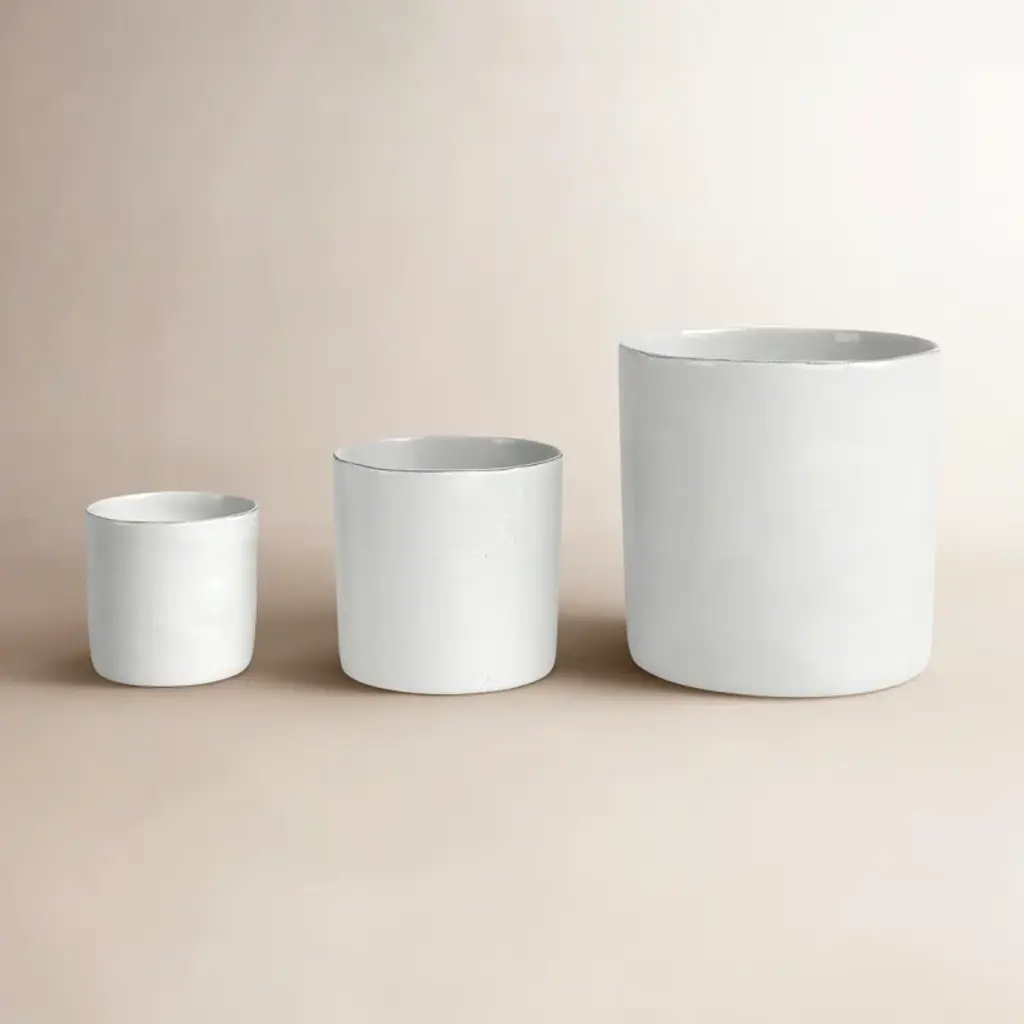 Lightweight composite cement mix planter pot in large size. Sprayed clean white finish with removable drain hole. Each may vary slightly in exact finish/texture.