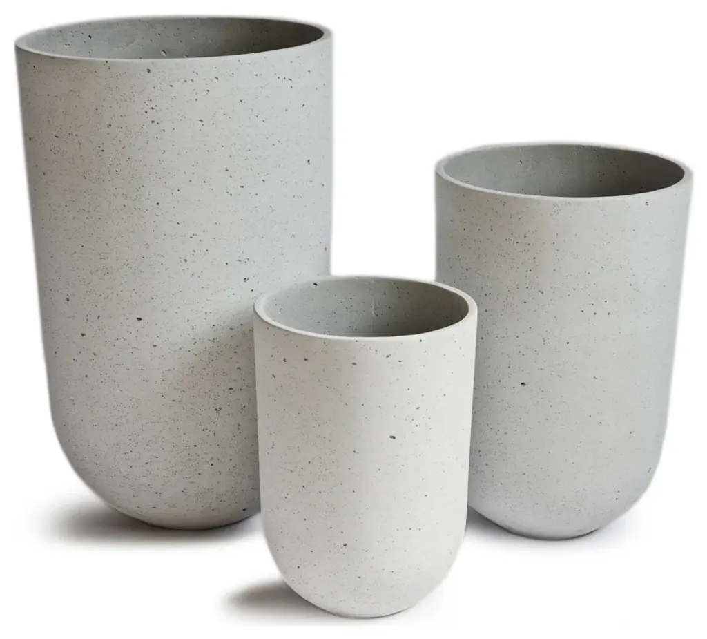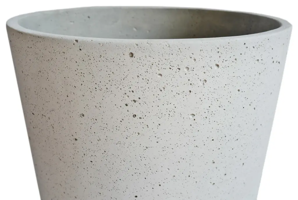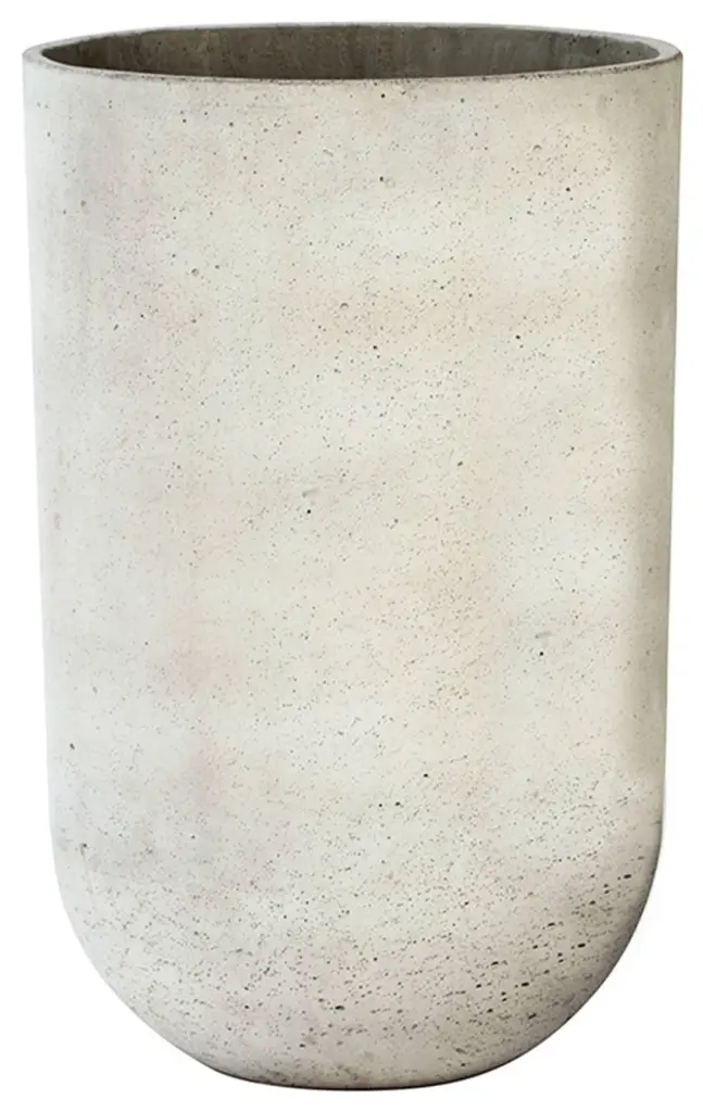 Lightweight composite cement mix planter pot in large size. Sprayed clean white finish with removable drain hole. Each may vary slightly in exact finish/texture.