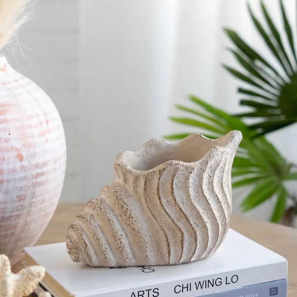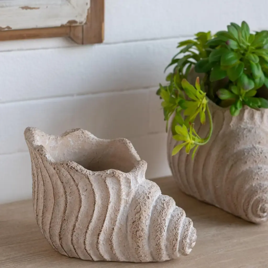 NAYSAYE Planters nautilus shell planter brings the calming beauty of the coast into your garden or home with its detailed design and textured beige finish. Perfect for succulents, herbs, or trailing plants, it adds a serene touch to any space. The neutral color palette complements a variety of design themes like coastal, rustic, and bohemian styles. Made from durable sand and cement, this planter is built to last while requiring minimal maintenance.