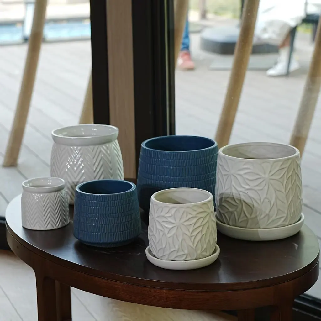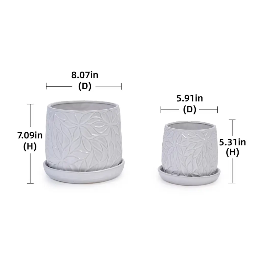 Naysaye Planter Set Of 2 Ceramic Planter Pot Elegant Embossed Leaf Design For Indoor Outdoor Garden, Gloss White, 8.08"*8.08"*7.09"