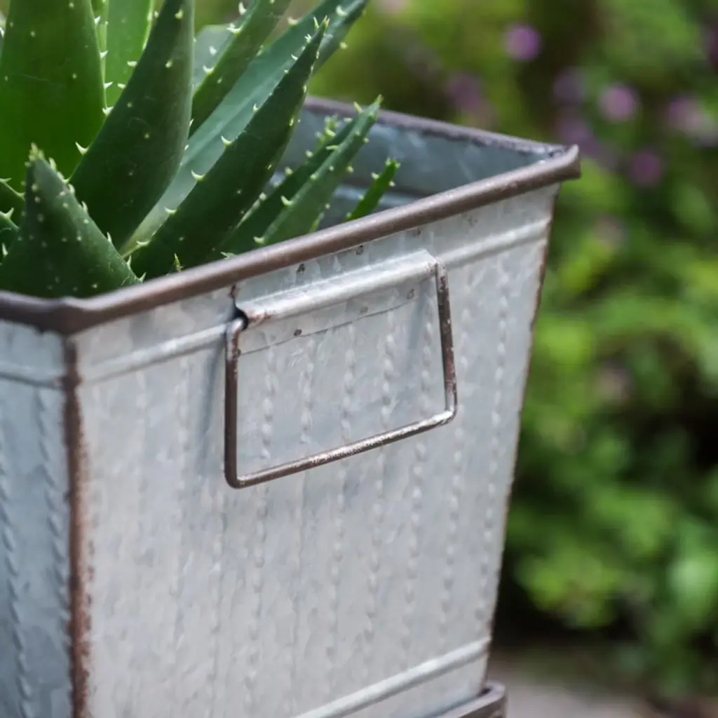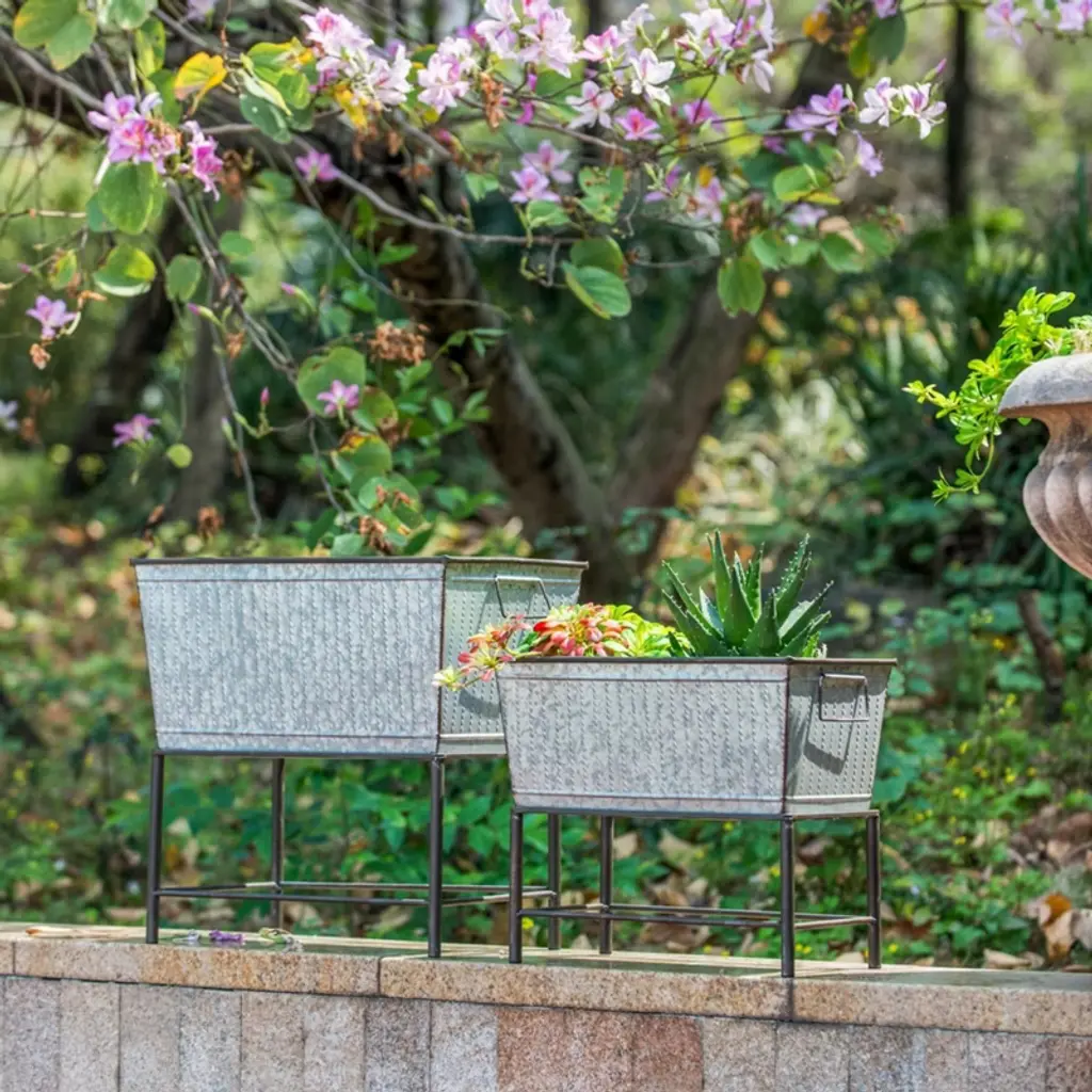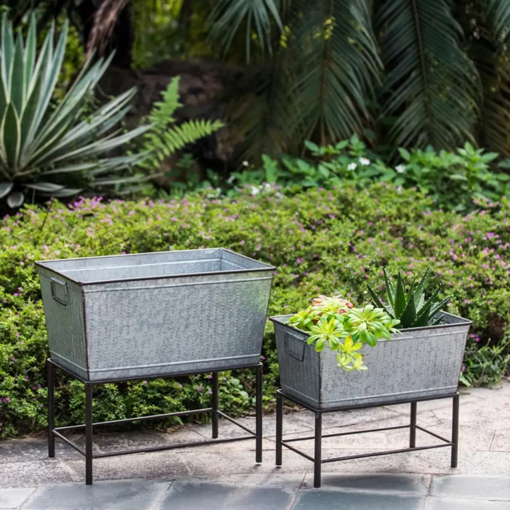 NAYSAYE Planters Set of 2 Zale Rustic Metal Planters with Stands brings a charming rustic touch to any space. Crafted from durable metal, these planters are designed to last with a weathered finish that enhances both indoor and outdoor decor. The elevated design offers easy access and a stylish way to display your plants. Perfect for patios, porches, or inside your home, these planters add a warm, earthy vibe to any setting.