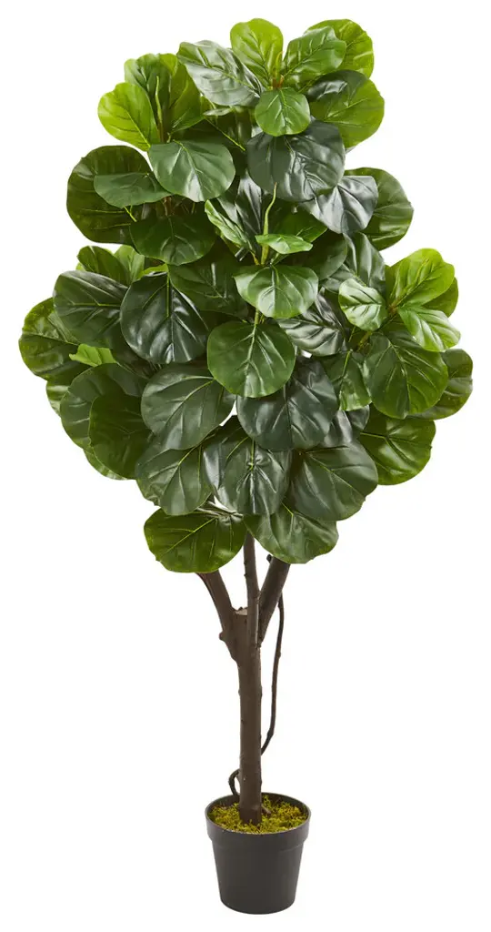 Bring the beauty of the tropics into your home with this fiddle leaf artificial tree. With its large green leaves that branch off a single thin trunk, it stands at a height of five feet. With ites unique decorative planter place this artificial tree near your enclosed patioes main table. To complete this tropical look, grab a potted artificial flowering plant with bright colored blossoms and use it as a centerpiece on the table.