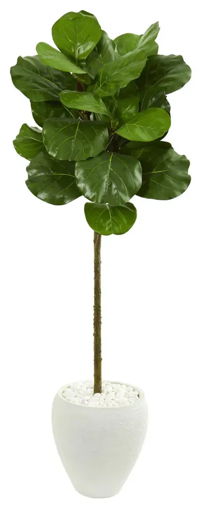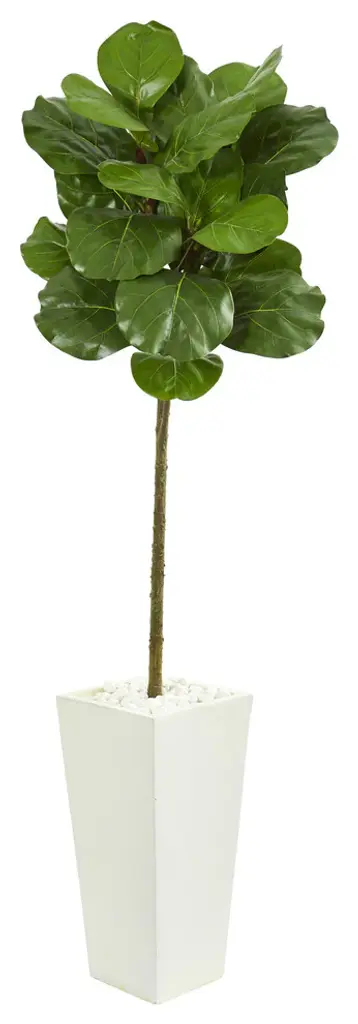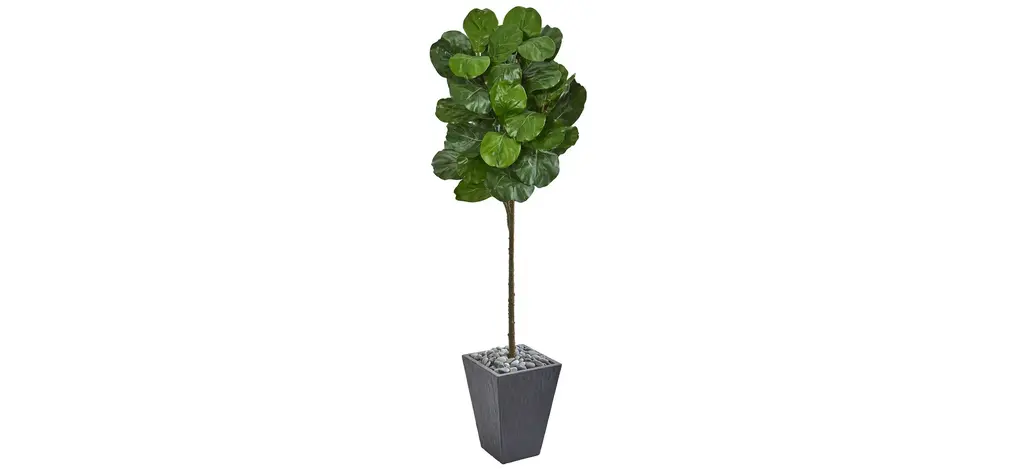 The green leaves of this 6e artificial fiddle leaf tree contain a noticeable sheen to themeas if water was running down their surfaces. With a slate finished planter included, use this piece to decorate your home or office by setting it near the roomes entryway, or tuck it in close behind a chair in order to witness the beauty of this artificial plant up close.