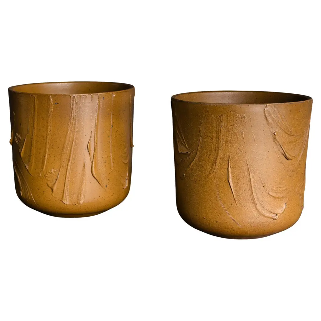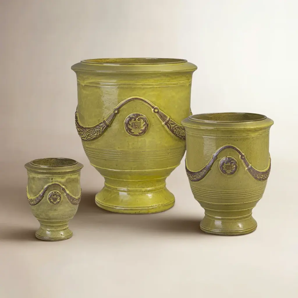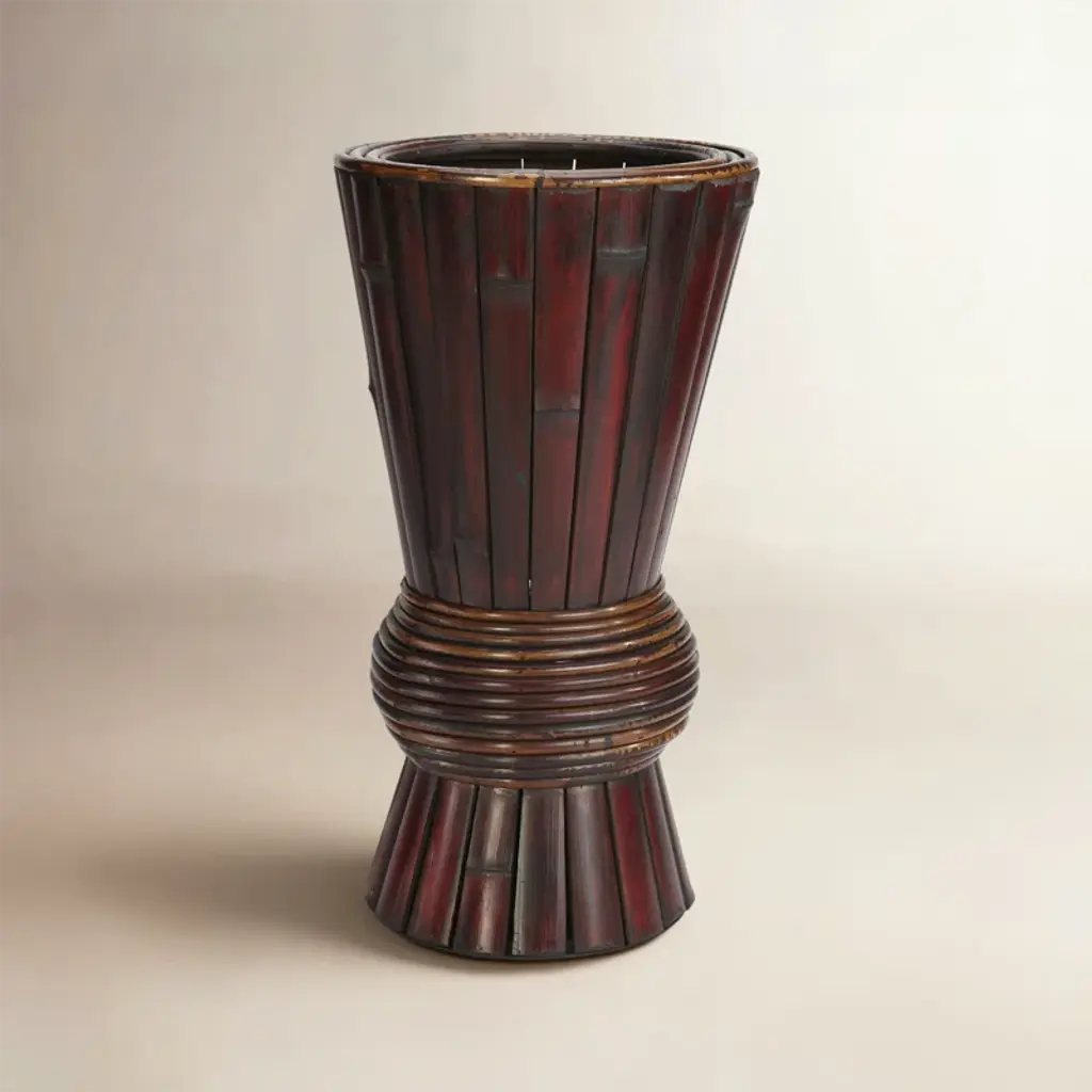 In a set of two (which doubles your decorating possibilities), this vase collection is sure to add to any Nearly Natural floral arrangement it holds. The 15 inch high and its smaller 10.75 inch sibling are both decorated with upward angled thatch design next to an intricately pressed vine patterned decoration. Each detained pattern is separated with rope designed trim. Comes on four thick and study cocoa colored legs for stability.