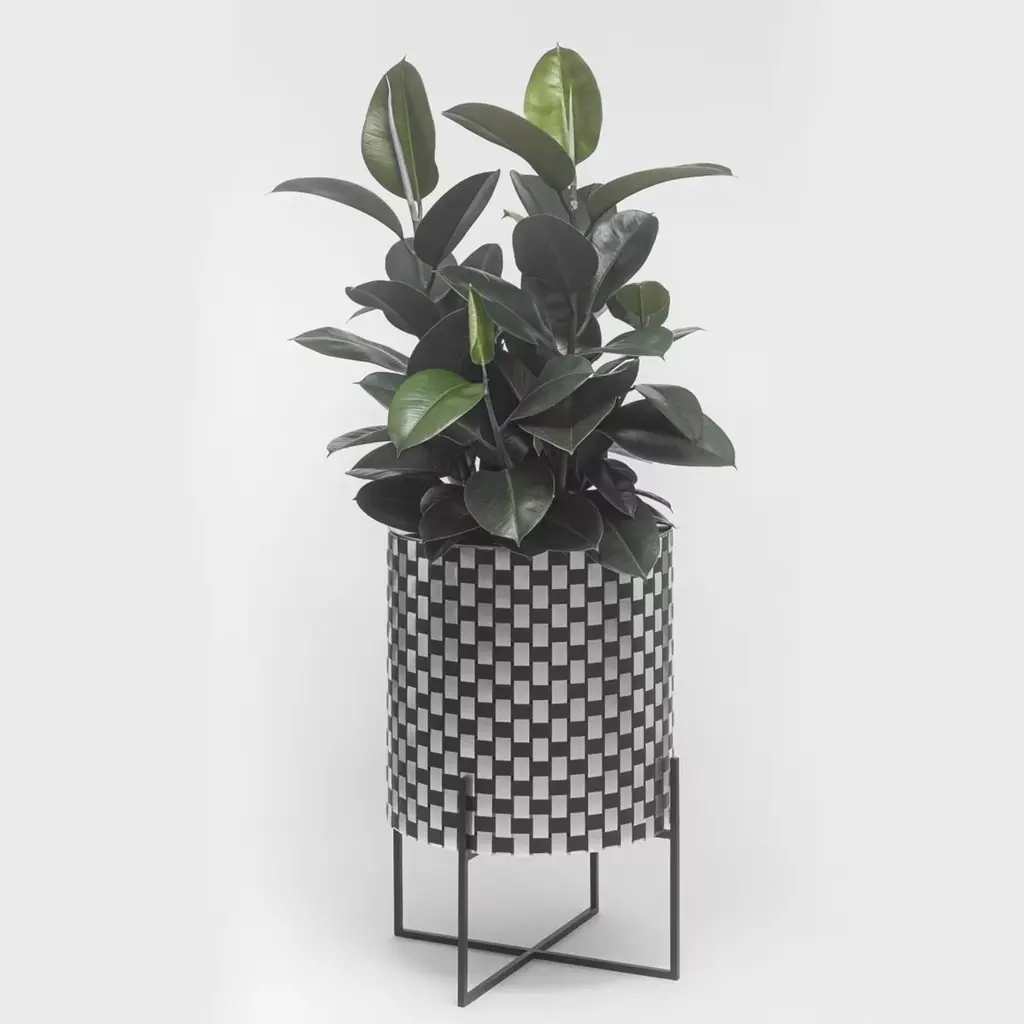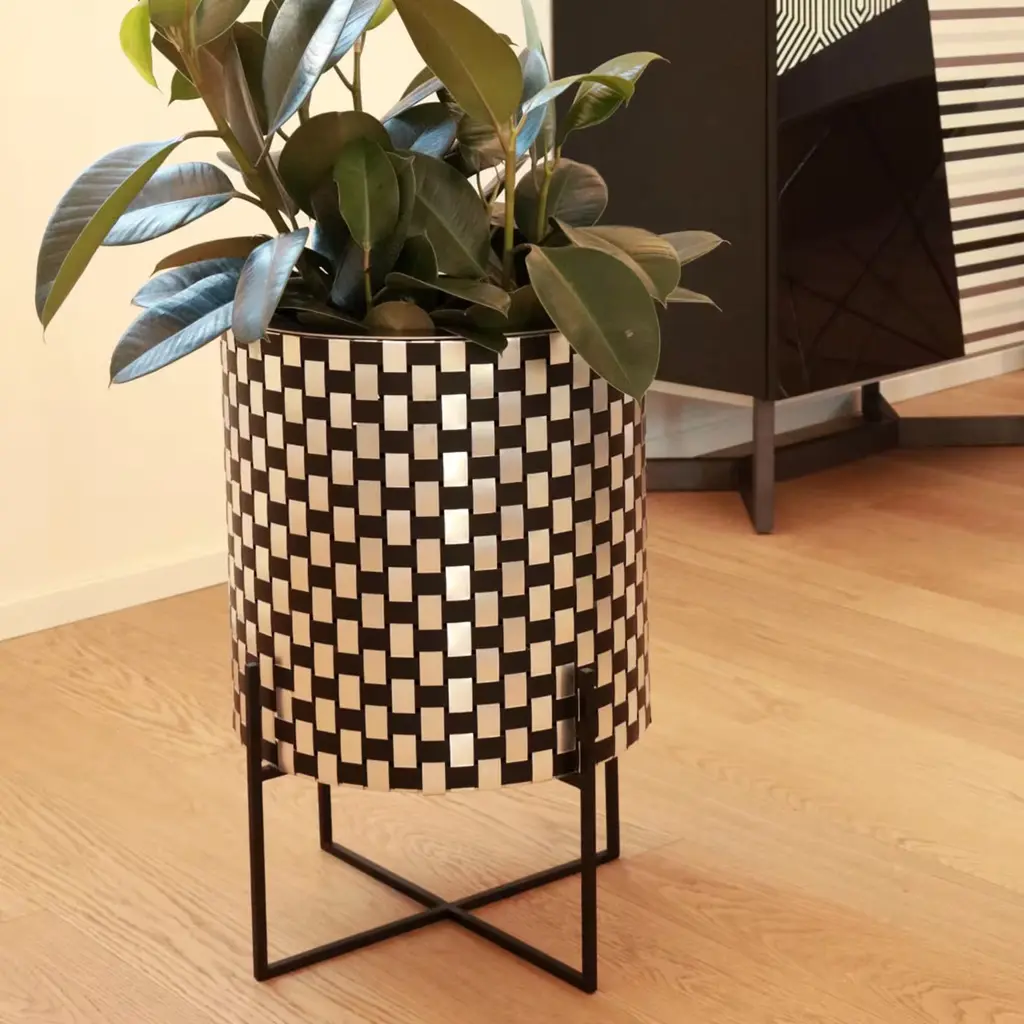 This sophisticated cachepot features an exclusive handwoven aluminum material, called Splot, created exclusively by Inthegarden Design Studio. The cachepot features a black painted iron crossed base - elevating the cylindrical vase holder approximately 10 cm off the ground - and a cylindrical vase holder with an internal steel structure and an optical, woven exterior fashioned using alternating black and natural aluminum foils. Available in three different sizes and finishes, please contact the Concierge for details.