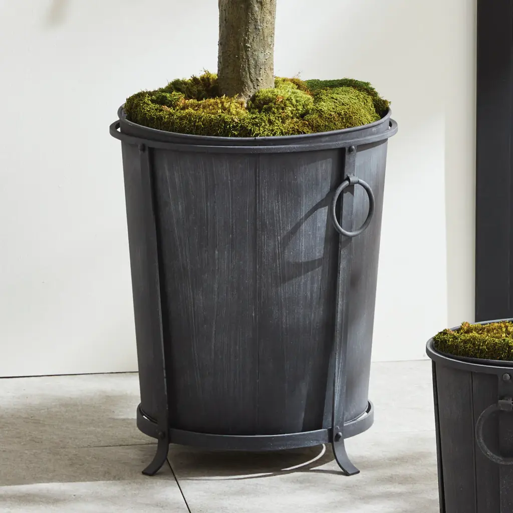 With a finish reminiscent of an aged European zinc, this handsome planter is made to maintain the original tone & texture over time, even when exposed to the elements. Removable liner has a drain hole fitted with plug, and scaled for large spaces, it is durable as well as beautiful. How brilliant!. European zinc finish. Iron construction. Indoor & outdoor use