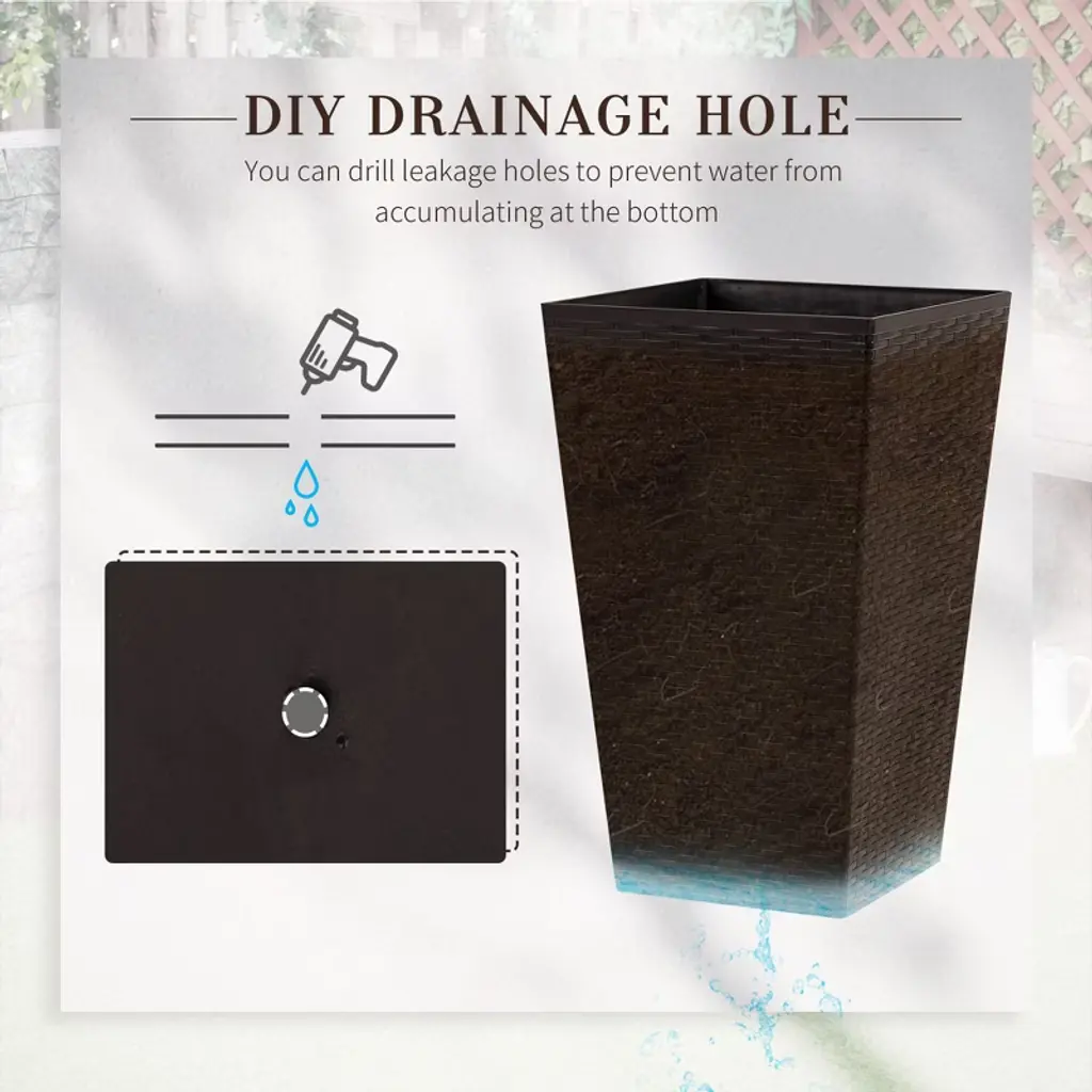 This set of three contemporary tall planters features a rattan-like texture, making them a versatile accent for various decors. Each pot has a drainage hole with a plug to prevent water accumulation, suitable for both indoor and outdoor use. Made from high-quality PP plastic, they prevent cracking and fading. These planters are ideal for patios, living rooms, offices, and more, adding a modern touch to your space.