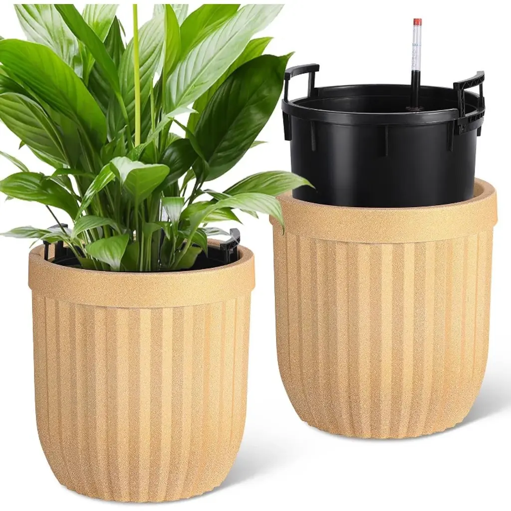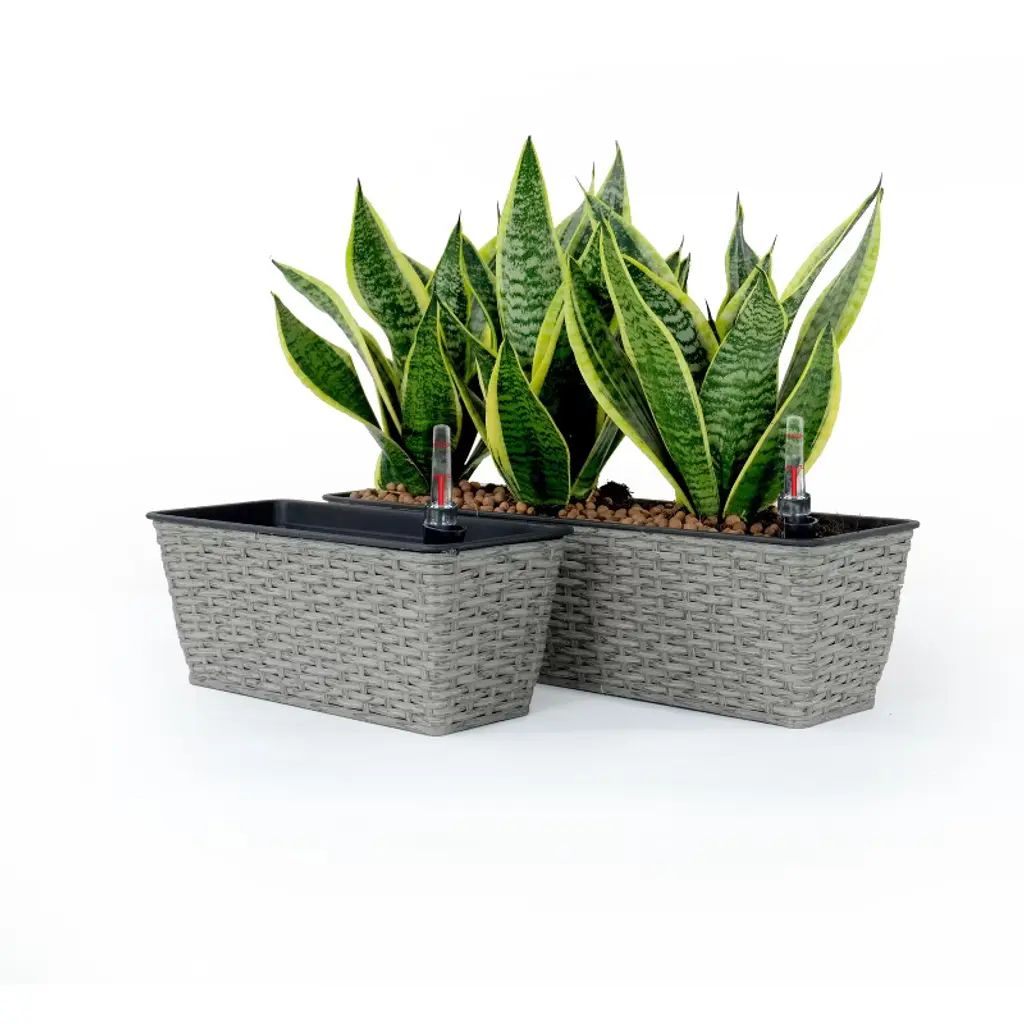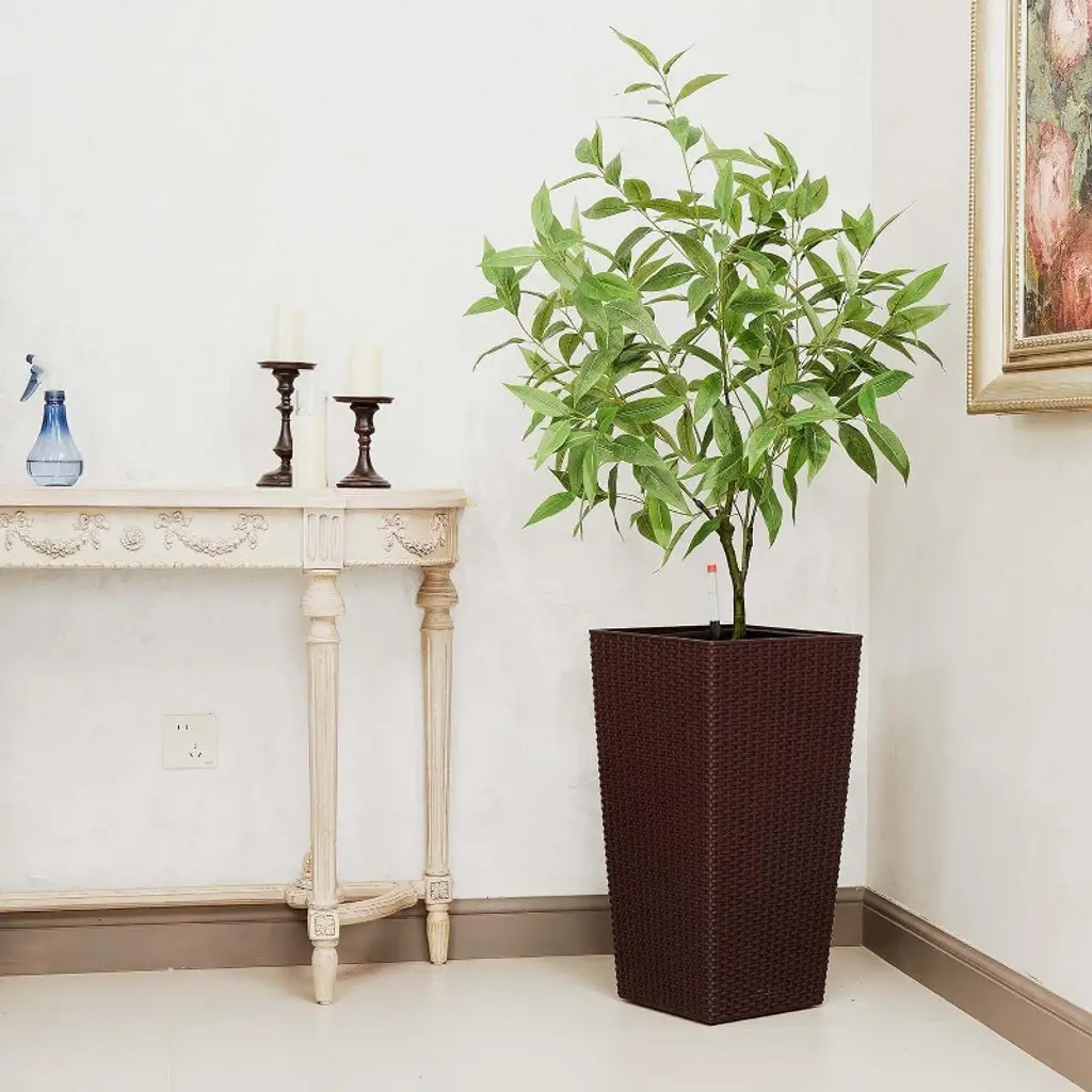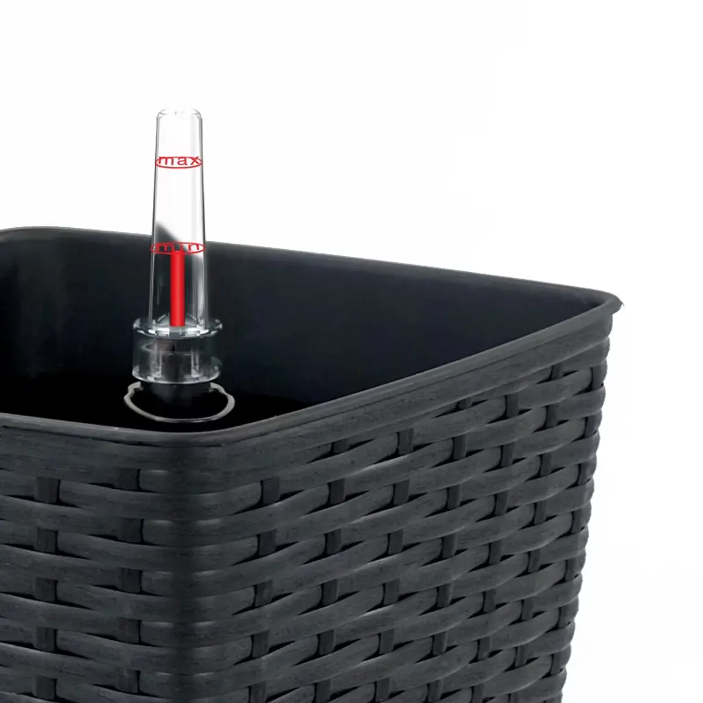 This self-watering planter features sub-irrigation from a reservoir to keep plants nourished for up to a week. It is weather-resistant and suitable for all conditions. The simple design and lightweight structure make it easy to assemble, move, or store. With a beautiful wicker finish, it enhances the style of any garden or corner. A water level indicator is included.