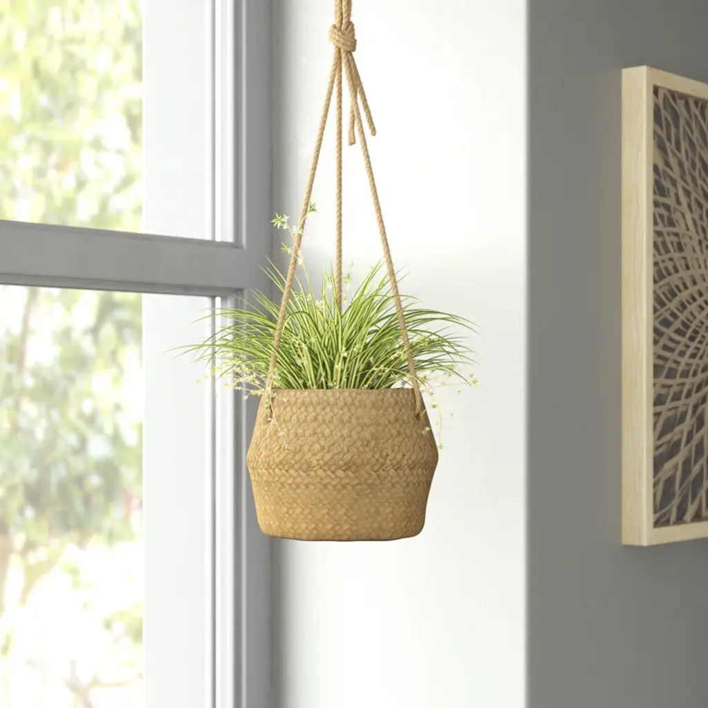 Elevate the look of a garden with this hanging planter with twine rope. The petite basket planter hangs securely from the twine rope hanger. Hang from the ceiling inside or from an outdoor pergola beam to keep a favorite plant within view.