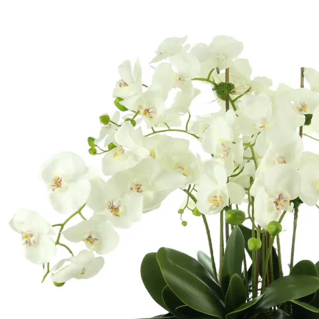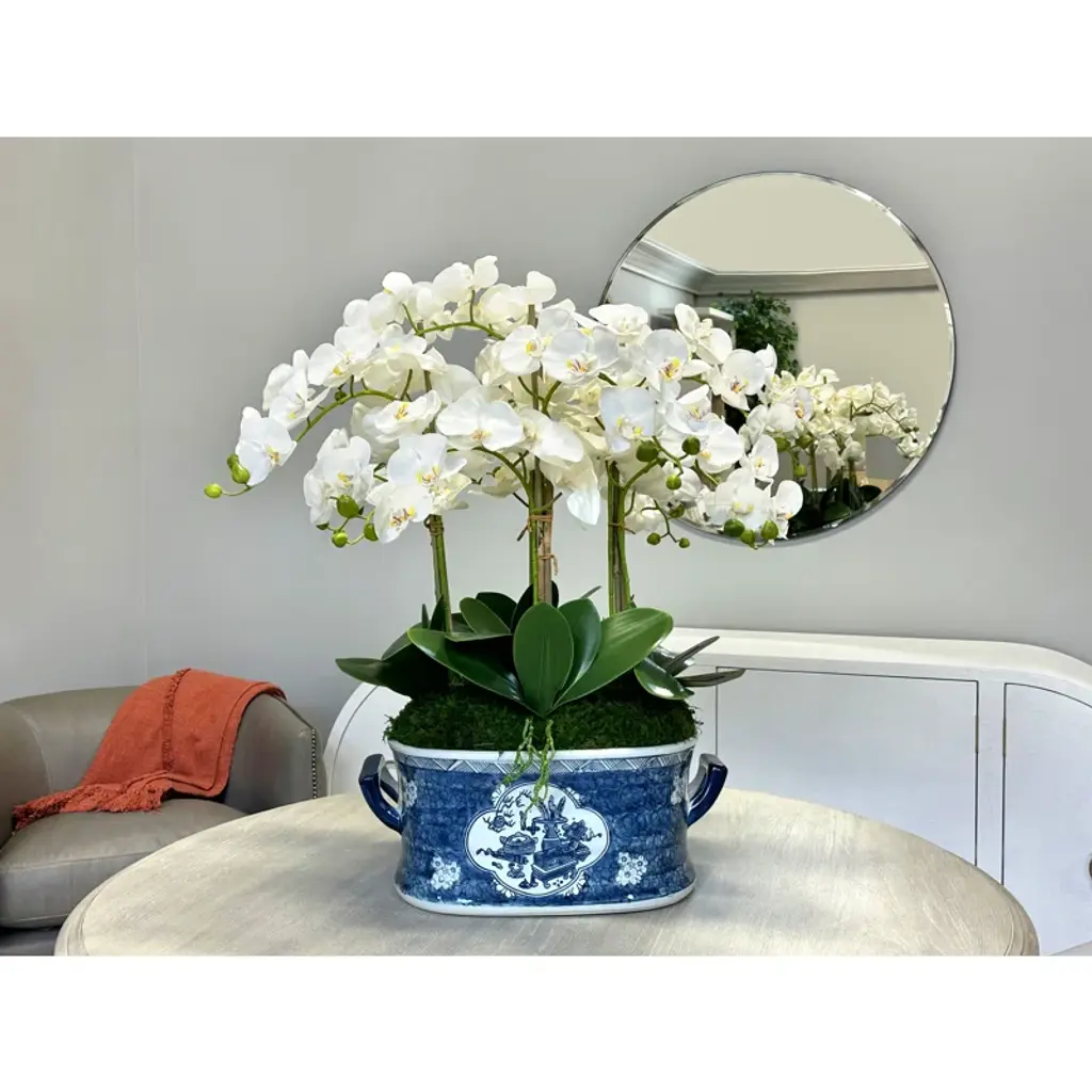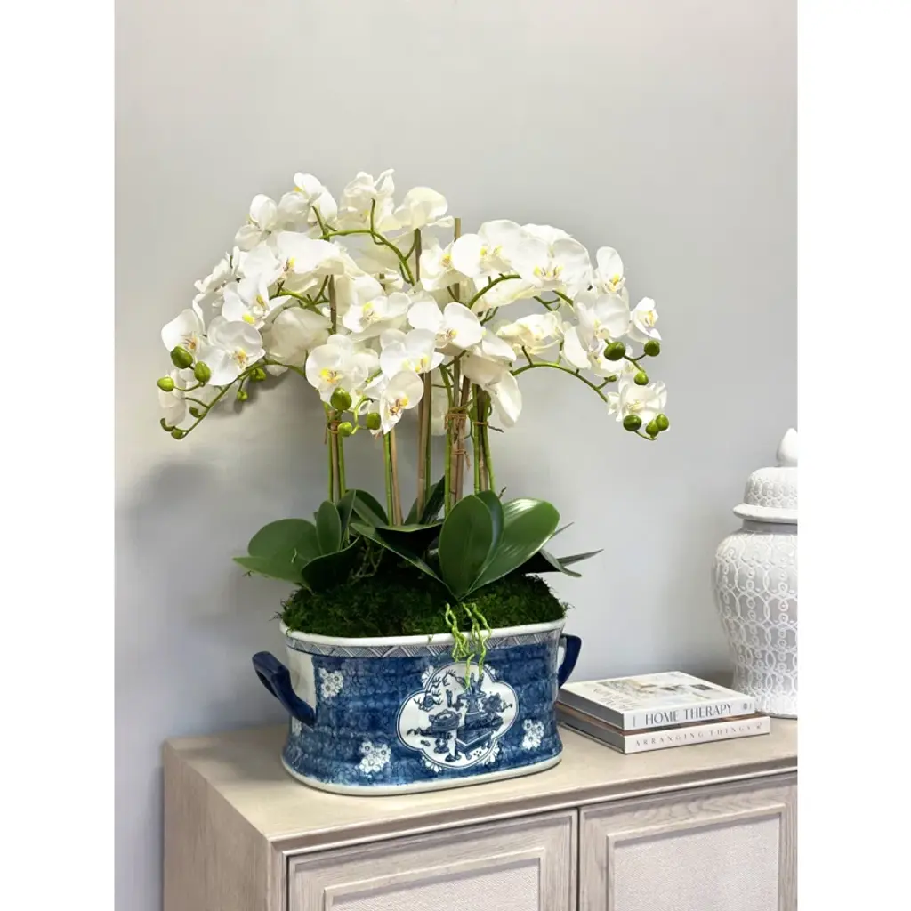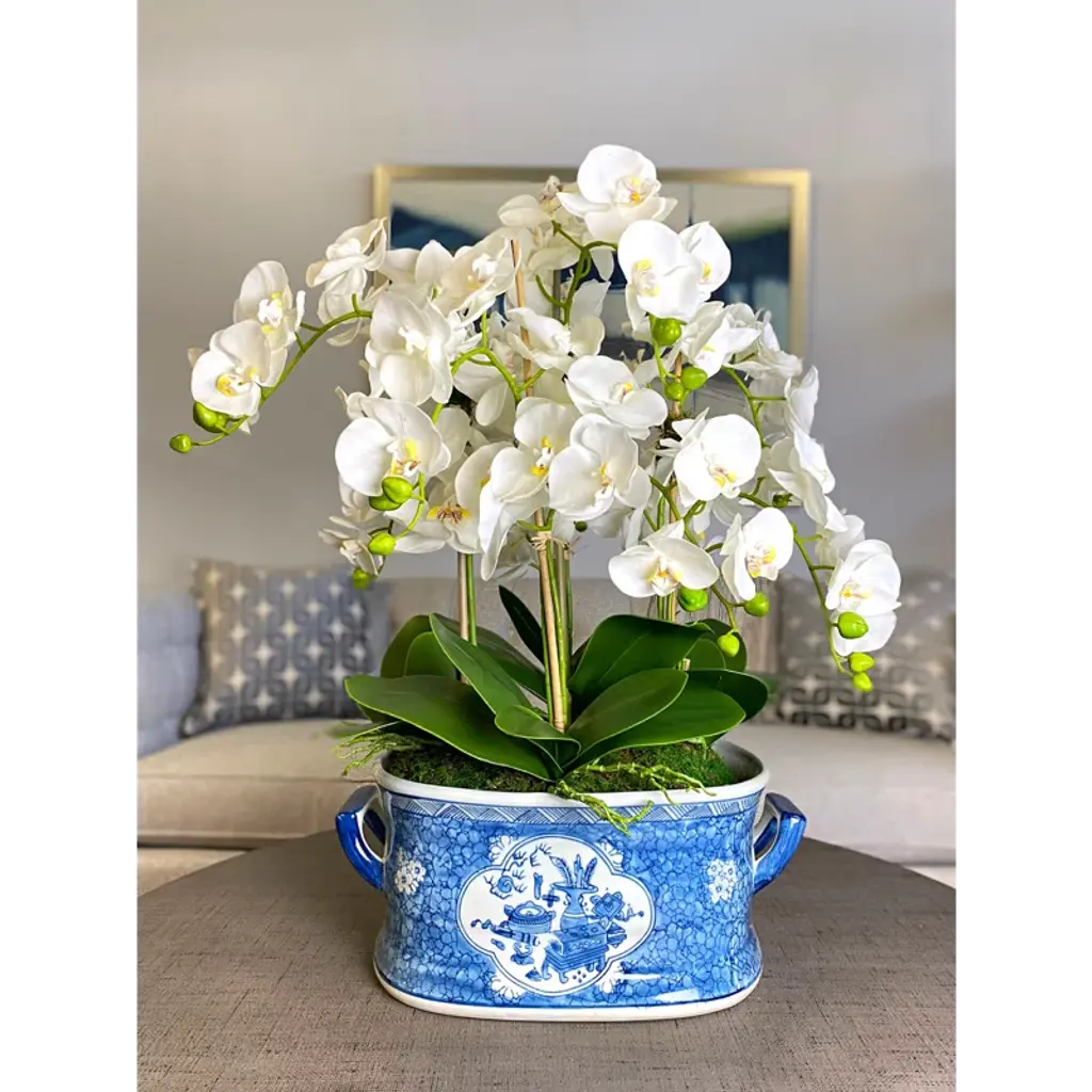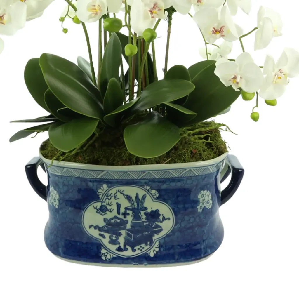 Attractive life-like Phalaenopsis Orchids are potted in a blue and white-handled ceramic vase. This beautifully designed arrangement will complement any decor, whether in your home or at the office.