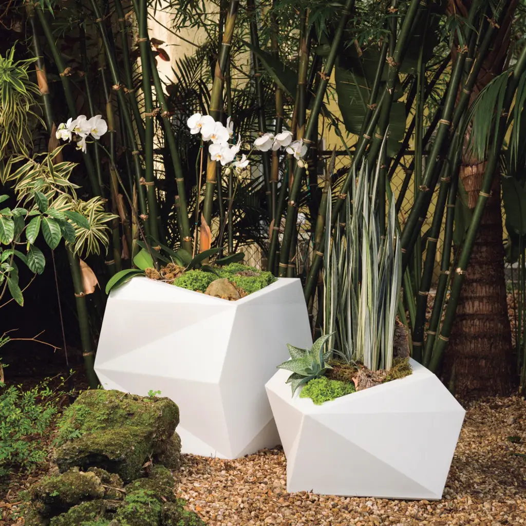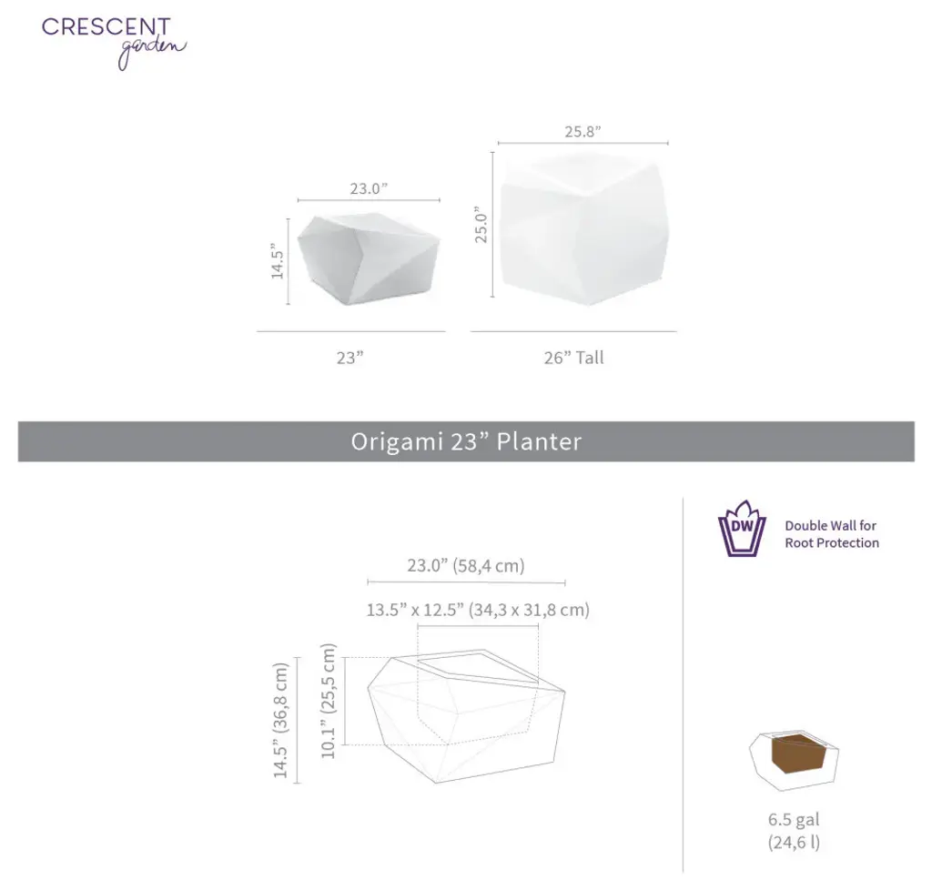 Incorporating modern architecture into a practical gardening essential, the Origami Tall Planter from Crescent Garden will display beautifully in any room in your home. The tall faceted planter lends itself effortlessly to sleek style, tying right into your current decor aesthetic. From succulents and ferns to money plants and snake plants, you''ll love showing off your knack for a green thumb. The double-wall planter also helps insulate the roots of your plants when the temperature shifts from cold to hot, preserving the longevity of the plant''s life.- Contemporary double-walled planter is a perfect indoor and outdoor planter for your leafy greens, botanicals and faux plants.- Constructed with 100% recyclable rotation molded plastic, making it lightweight, chip-resistant and durable.- The weather-proof planter structure, backed by a 10-year warranty, ensures the planter won''t fade or crack during extreme temperatures.- Features a pre-drilled drainage hold for easy planting- Inner dimension: 13.5" x 12.5 W " x 10" H ; Soil capacity: 6.5 gal