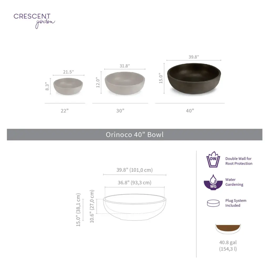 Creative options are limitless with these attractive, functional, and massive Orinoco bowls. Whether you create tiered garden by stacking the three sizes or design your own unique fountain, you can rely on their durability to last throughout the weather extremes. An ideal bowl planter for succulent gardens too. INDOOR/OUTDOOR : Double-walled planter is a perfect indoor and outdoor planting bowl. LIGHTWEIGHT & DURABLE: Constructed with 100% recyclable rotation molded polyethylene, making it lightweight, chip-resistant and durable. WEATHER-RESISTANT : The weather-proof planter structure ensures the planter won''t fade or crack during extreme temperatures. DRAINAGE HOLE: Pre-drilled drainage hole & plug inlcuded. Use plug for water garden and remove plug for planting. 10-YEAR WARRANTY DIMENSIONS: Inner Bowl Dimension: 36.75" W x 10.63" H ; Soil capacity: 40.7 gal