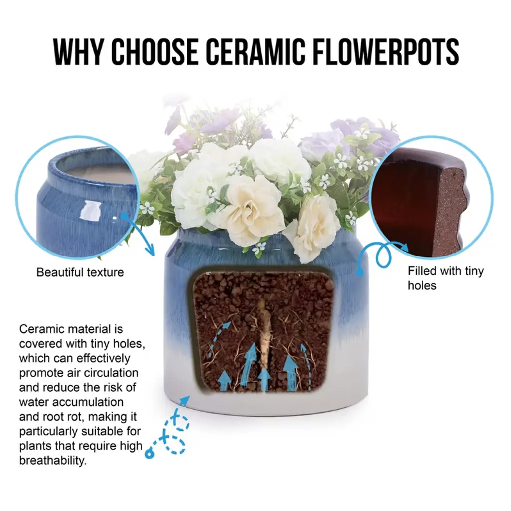 Style meets function! These modern ceramic planters feature a beautiful blue-white gradient glaze, drainage holes for healthy plants, and all-weather durability. Perfect for patio, garden, or windowsill—add elegant greenery to any space! Set of 2.