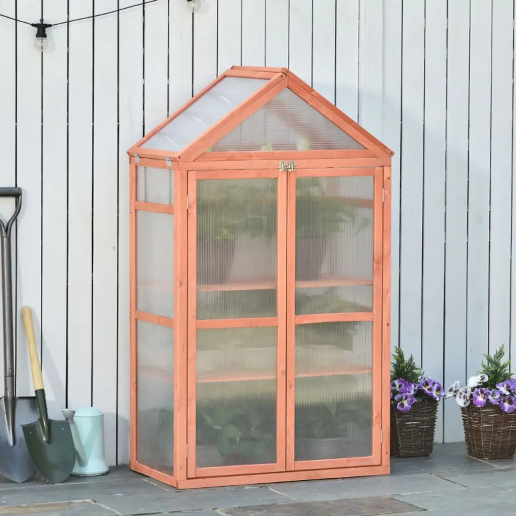Outsunny 32" X 19" X 54" Garden Wood Cold Frame Greenhouse Flower Planter With Adjustable Shelves, Double Doors, Orange
