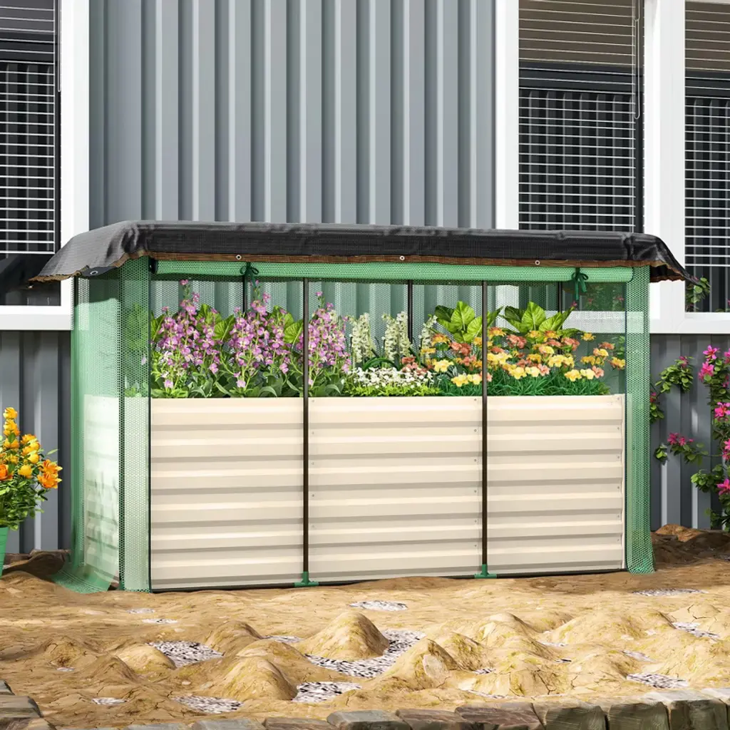 Introducing the Outsunny outdoor planter box crop cage combo. Mesh keeps birds and other animals at bay while allowing sun and rain to nourish the plants inside. A roof shields plants from the heat, preventing burns. An open-bottom garden bed allows drainage and gives long-root plants the room they need to grow. Made from galvanized steel, this metal garden bed withstands weather without cracking. Use the garden bed and plant cage together or separately. Raise your green thumb with Outsunny.
