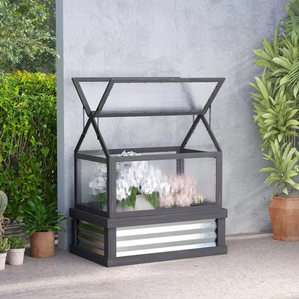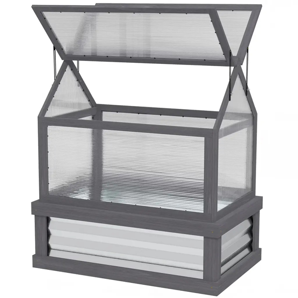 Outsunny Raised Garden Bed With Polycarbonate Greenhouse, Wooden Cold Frame Greenhouse, Garden Flower Planter Protection, 35.5"x22.5"x38.25", Gray