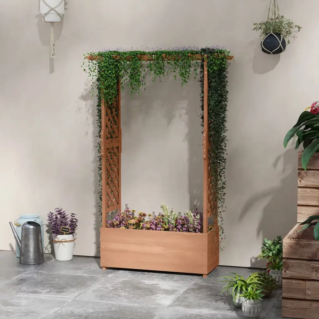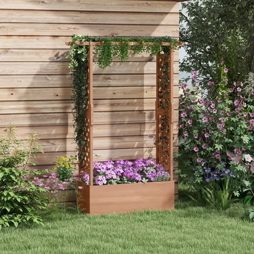 With two trellises to help vines climb and a pergola-like roof for hanging flower pots, this raised flower bed can accommodate almost any plant you can imagine. It's self-draining to keep plants free from water logging, and a filter stops soil from falling through after rain or watering. Wood gives it a classic, rustic look, and it's been coated to endure weather each season. Raised away from weeds and wild animals, this trellis planter is a lifted fortress for your flowers.