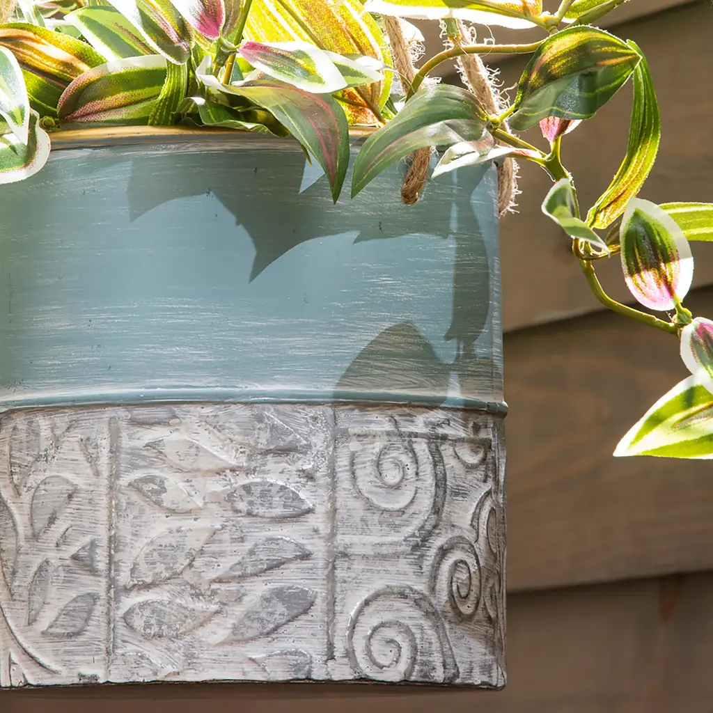 Instantly elevate the display of flowers, plants, succulents, herbs and more with these pretty Painted Metal Hanging Planters. The embossed botanical pattern and brushed colored finish create a beautiful coordinated display that can be used together or separately. The quality metal construction is weather-treated and fade-resistant so the planters are safe to use indoors or outside. Display is made easy with the sturdy jute rope hangers while also adding a rustic touch to the design. Set of 3, planters come in small, medium, and large sizes and coordinating colors of light green, light blue, and a darker sea blue. Use them wherever you want to upgrade your display!