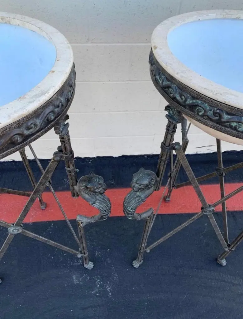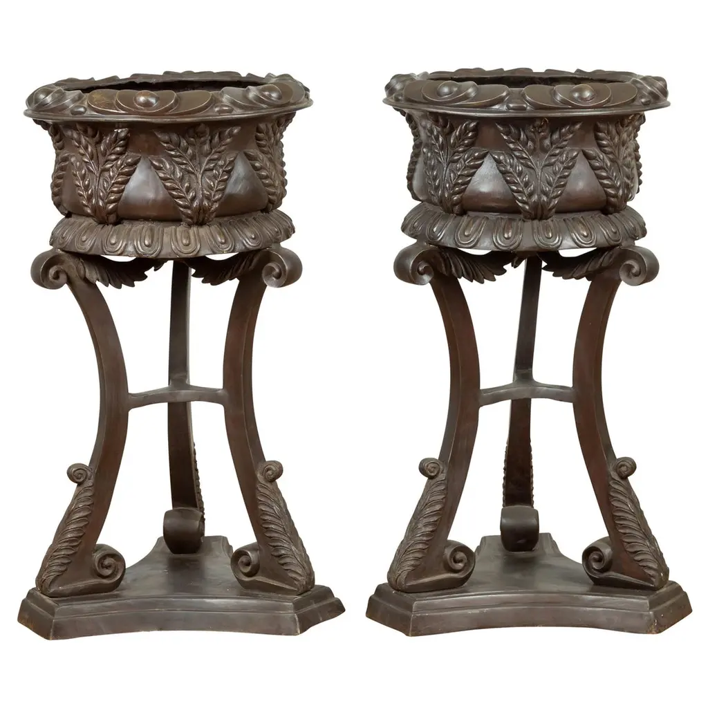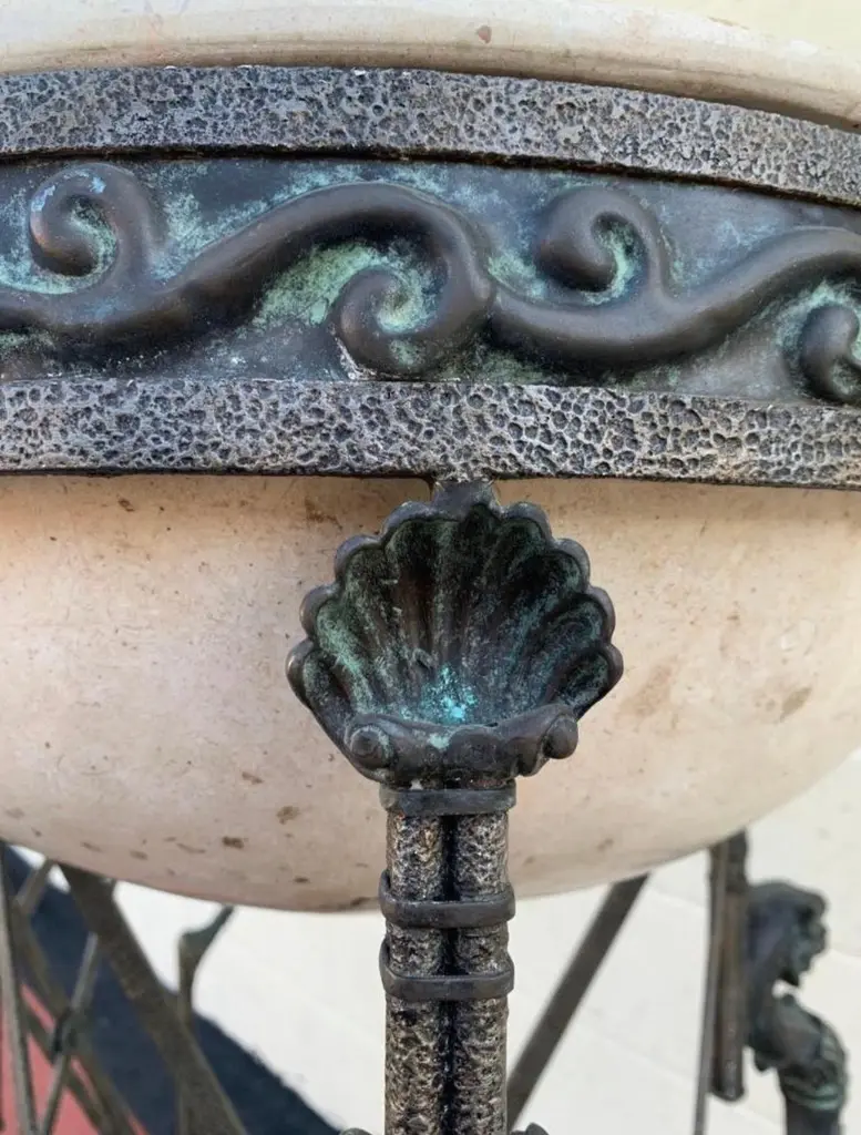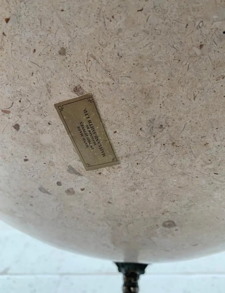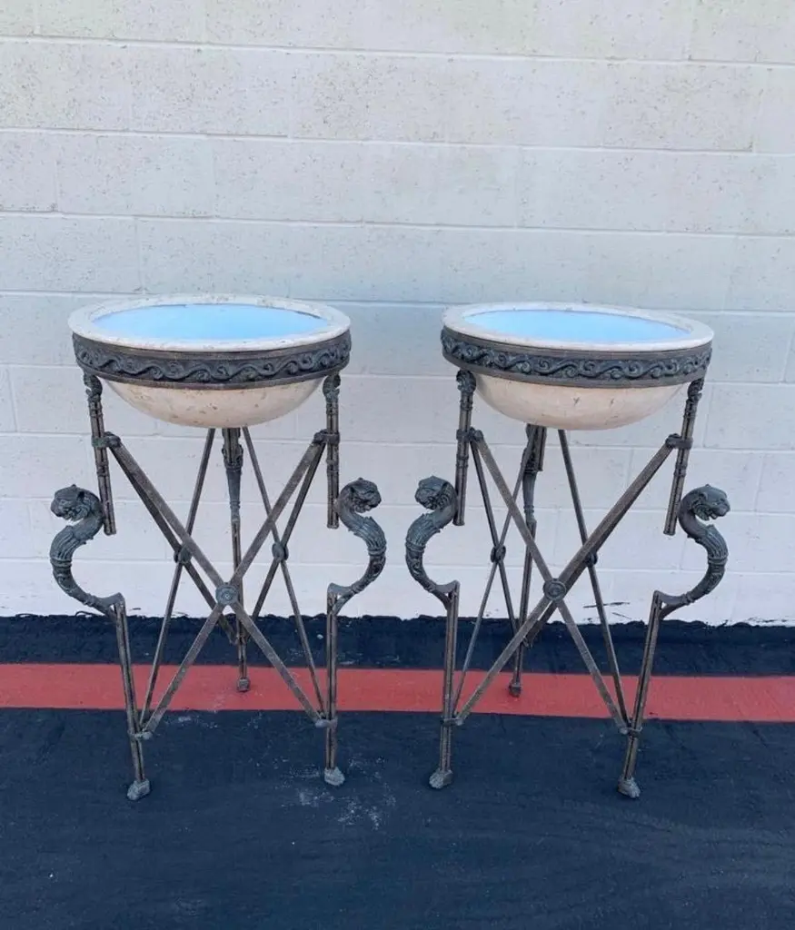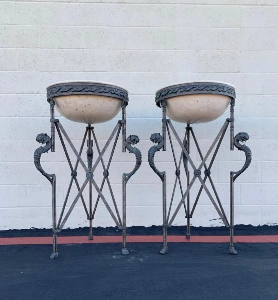 Wonderful pair of pedestal planters. From the 1980s. The bases are made out of metal and bronze. And the pot it is done of travertine. They are made by Maitland-Smith. And they are from Philippines. They have the label in the bottom of the pot, (you can easily see it in the photos). In really good condition. No damages, broken or missing parts. Great style!!!-----------------------------------------------------------------------------------------------------------------------Whenever you purchase an item from Mid Century Shop, you're acquiring a piece that has been evaluated by our experts to offer you the finest pieces in terms of quality, style, and timeless design. You'll also benefit from the experience of our team, who specialize in identifying authentic vintage pieces and have dedicated over a decade of their lives to what they do best: finding unique theaters that have endured through the years. Remember, our goal is to make your renovation process a breeze.