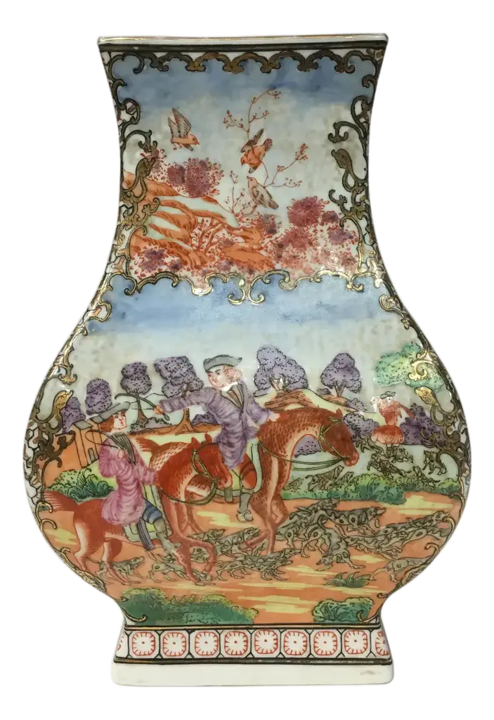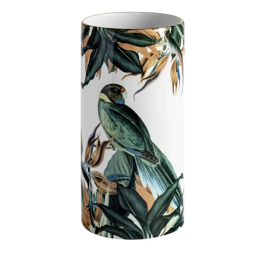Birds on tree branches singing sweet songs are depicted on this beautiful porcelain planter, embellished with a metal lip, handles, and foot.