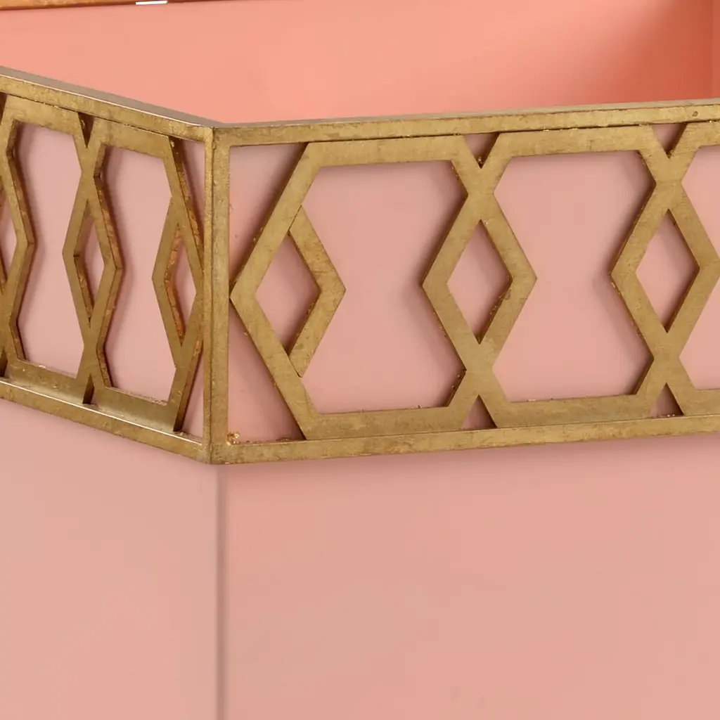 A classic planter featuring metallic satin gold interlocking honeycomb detail to elevate the look of any powder room or office. Available in a variety of colors. Designed by Shayla Copas.