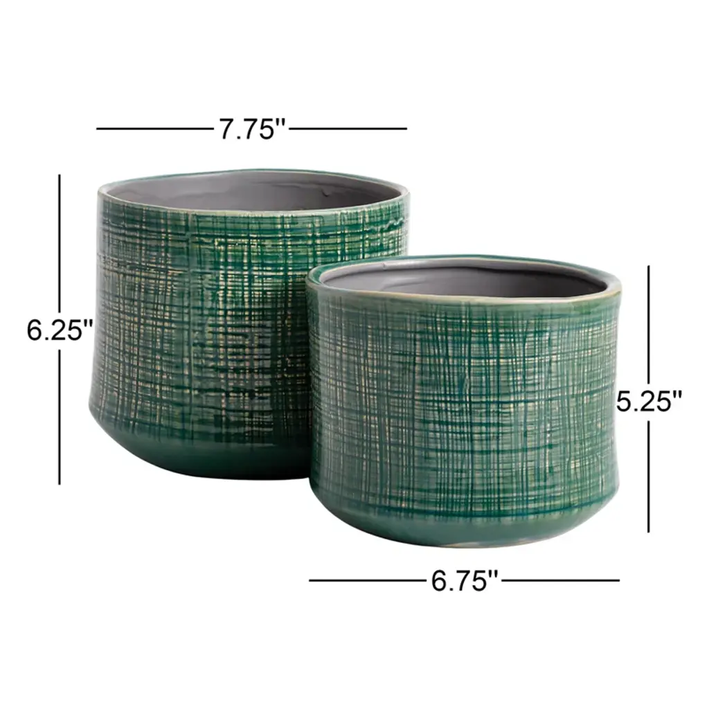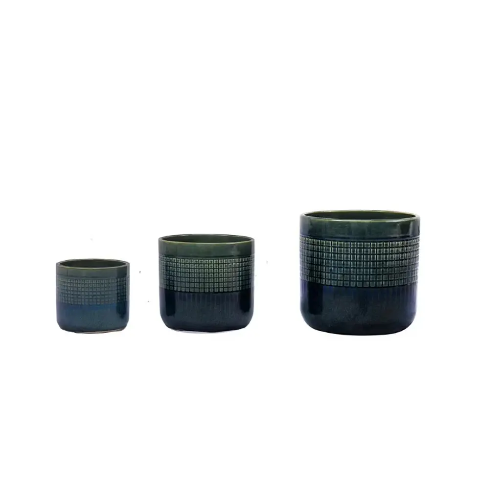 With an organic shape and textile-inspired crosshatching pattern, the Phoenix pots are a fashionable set. A high gloss finish and deep rich glaze are a great compliment to ferns, flowers or succulents.
