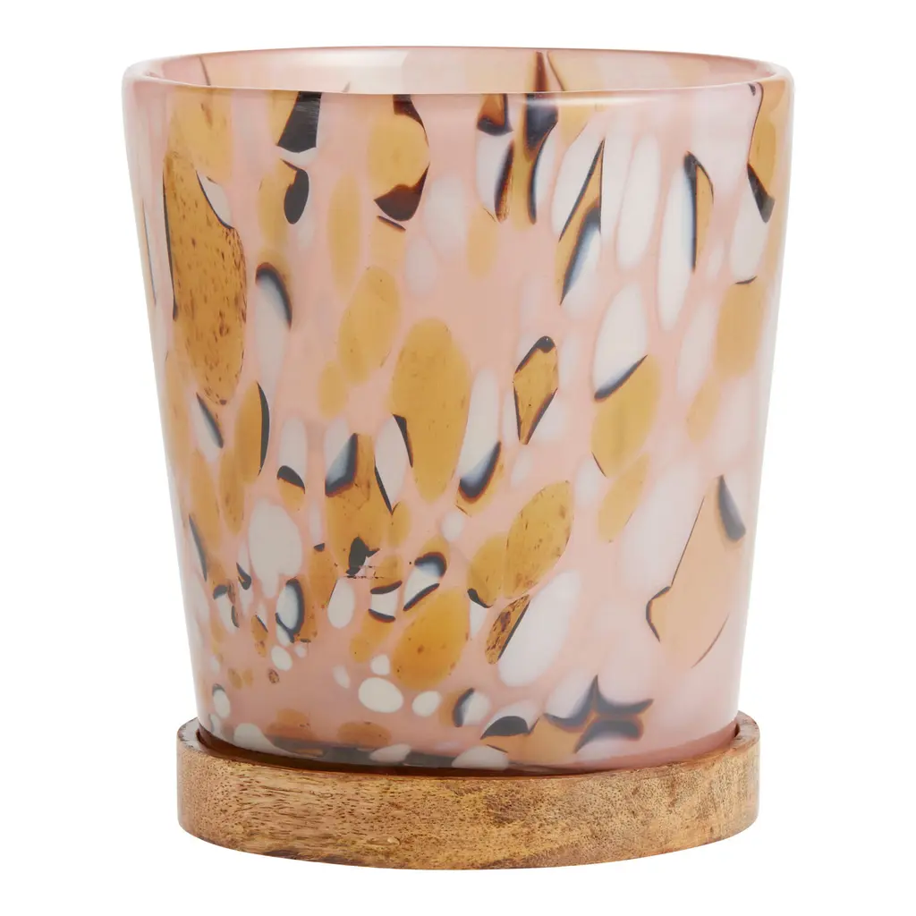 Striking and singularly chic, our blush-pink planter is handcrafted of glass to create leopard print-like striations in shades of gold, brown and white. This one-of-a-kind plant pot sits on a natural wood base, lending a warm, organic touch to your decor.