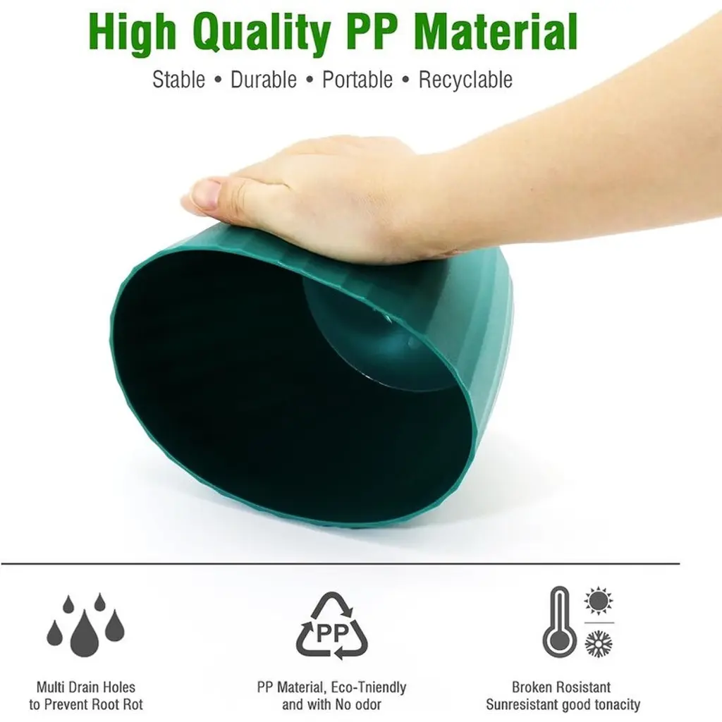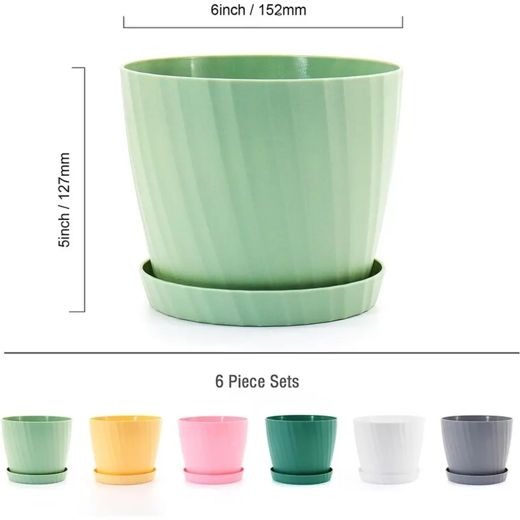 FLEXIBLE & STURDY PP MATTE MATERIAL:Matte exterior finish colorful plant pots with 3mm thickness polypropylene plastic, sturdy but lightweight that no worring about cracking. These planters for plants are easy to clean and get clean of dirty easily on the outside, it's not a stained looking mess. DROP-SHAPED DRAINAGE HOLES & REMOVABLE SAUCER:Each flower pot have 20 drainage holes at the bottom that help to drain excess water effectively and quickly, but the drop-shaped holes can be prevent the soil from draining with the water. Also prevent house plants overwatering. EASY TO REPOTTING PLANT POTS:6 Pack 6 inch Planters are great transplanting for all small indoor and outdoor plants flowers which size between 3''~5''. We suggested that Soil with 1 quart (1L) = 0.03 cu. ft. for 6 inch pot, suitable for growing most indoor and outdoor small to medium plants like Aloe Vera, Snake Plants, Spider Plants, Pothos, Peace Lily, ZZ plants, Orchid, Succulents, Mint, Orchid, Parlor Palm, Cactus, herbs, etc. DECORATION YOUR HOME GARDEN:6 pack 6 inch planters with colorful speckles, transplant plants to these pots, fill up with mix soil, water and let drain, then place a saucer under each plant. Brings a new stylish home garden. Pefect for hanging up or placed on windowsill, shelf, bedroom, kitchen, office, desktop, garden, etc. MODERN MINIMALIST DESIGN:White matte finishing surface plant pot with strip pattern and round shape design bringing out a modern minimalistic styled and elegant. And bottom surface has feet like lines to prevent from sliding. This plastic planter will bring a modern and stylish visual. Great for all house plants.